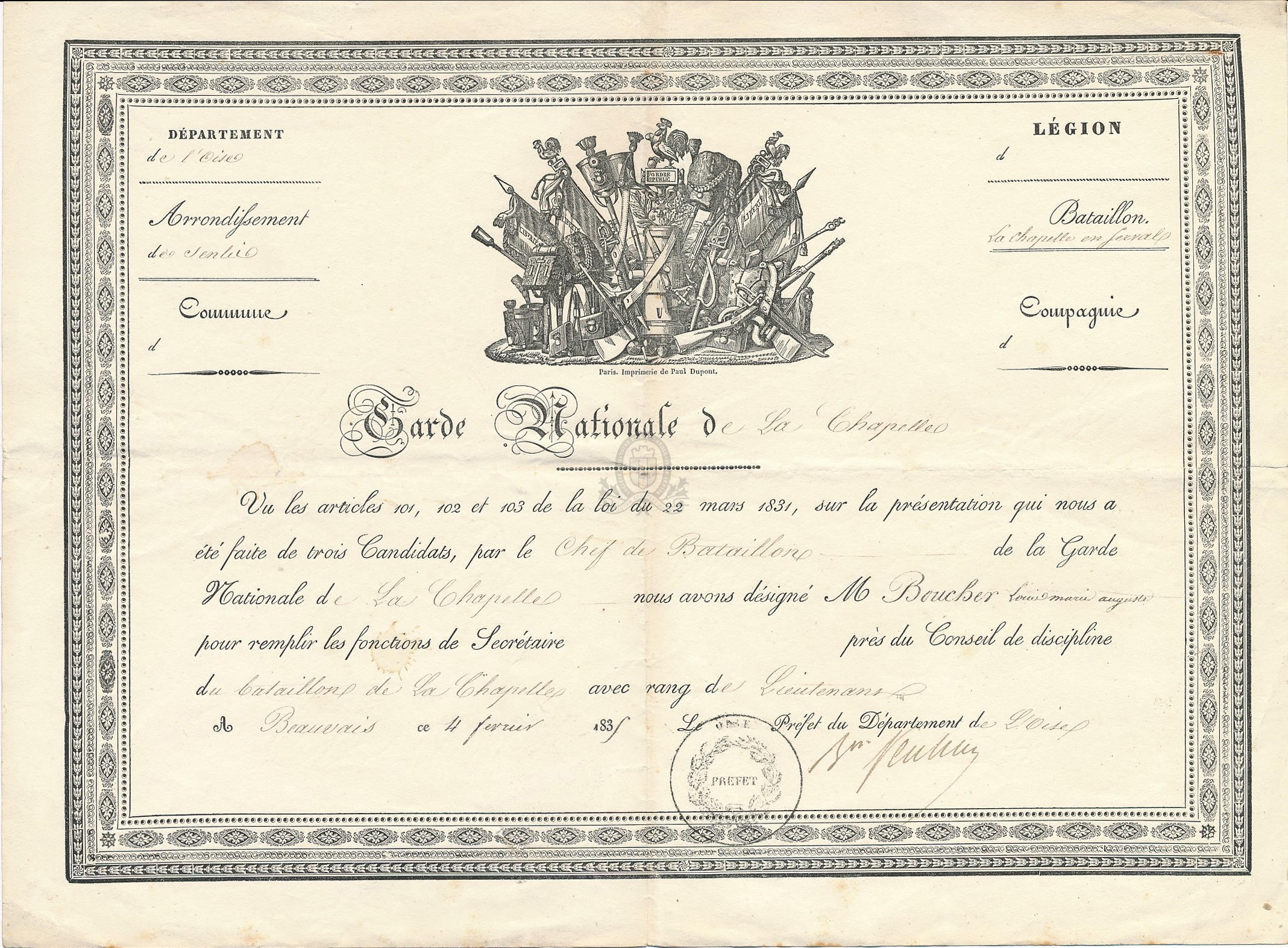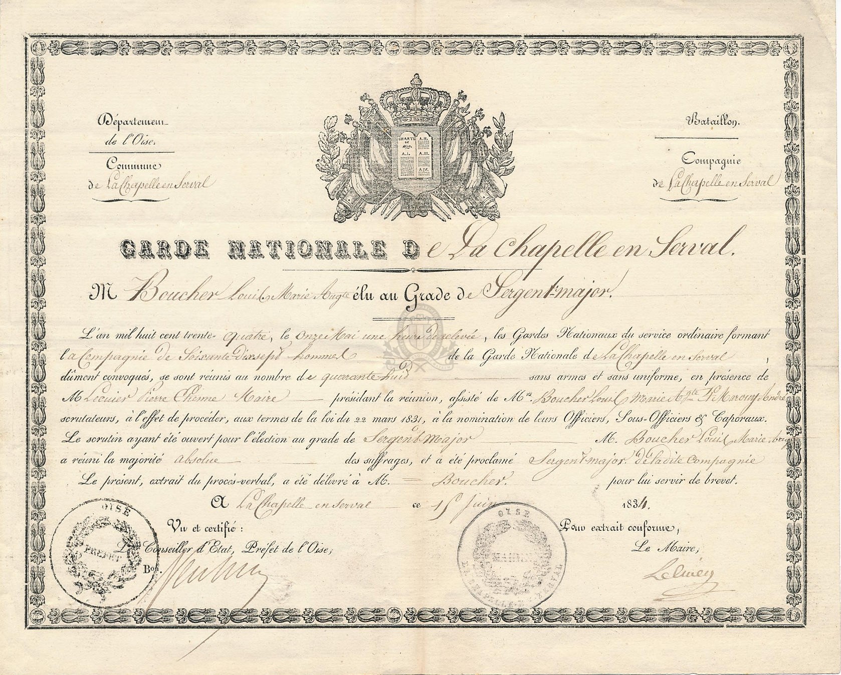 PermalinkBrevet de la Garde nationale de La Chapelle en Serval délivré à M. Boucher Louis Marie Auguste, élu au grade de sergent-major le 11 mai 1834 / La Chapelle en Serval (1834)