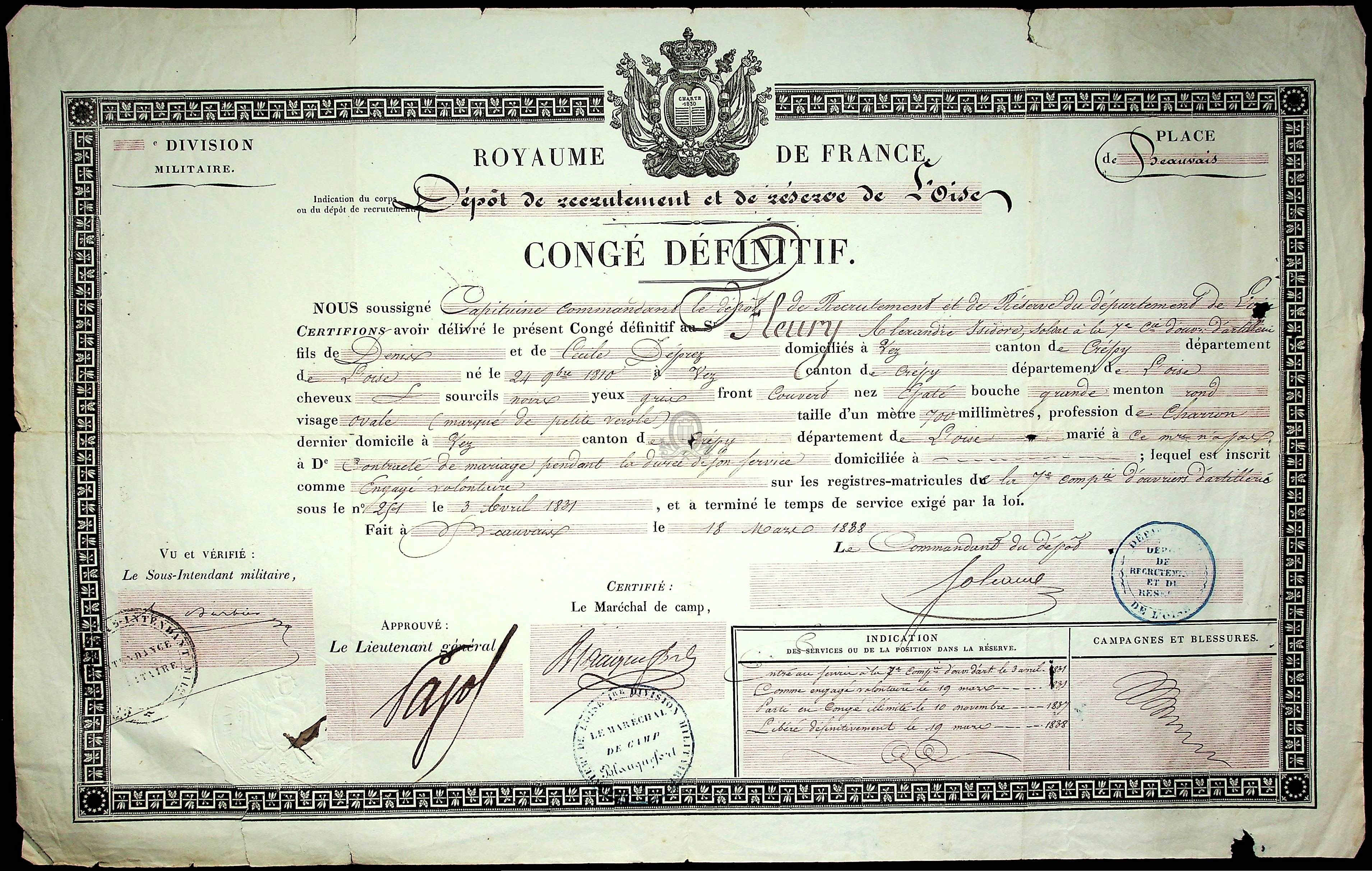 PermalinkCertificat de congé définitif délivré au Sr Fleury Alexandre Isidore, soldat à la 7e Cie d'artillerie / Dépôt de recrutement et de réserve du département de l'Oise (1815-1848; Beauvais) (1838 (03-18))