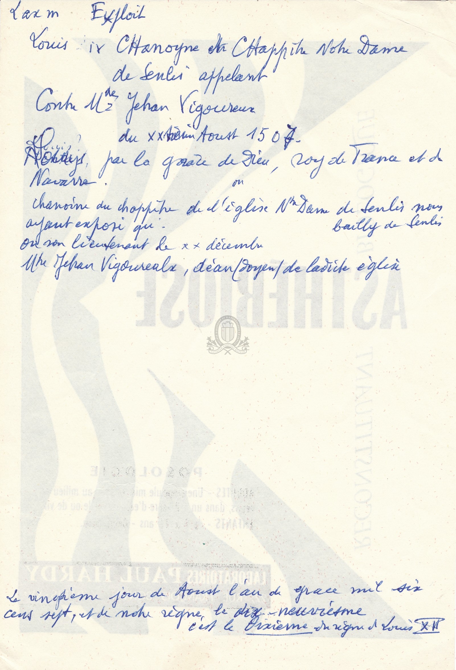 Affiner la recherche Interroger des sources externesExploit pour les chanoines et chapitre Notre Dame de Senlis appelant contre Mtre Jehan Vigoureux, doyen de ladite église / Léon Dautheuil (1507 (08-28))