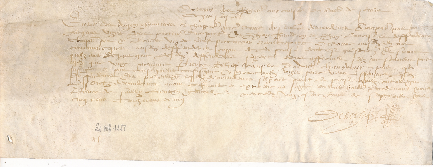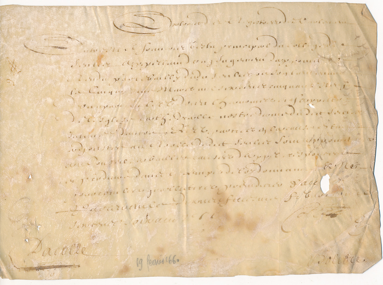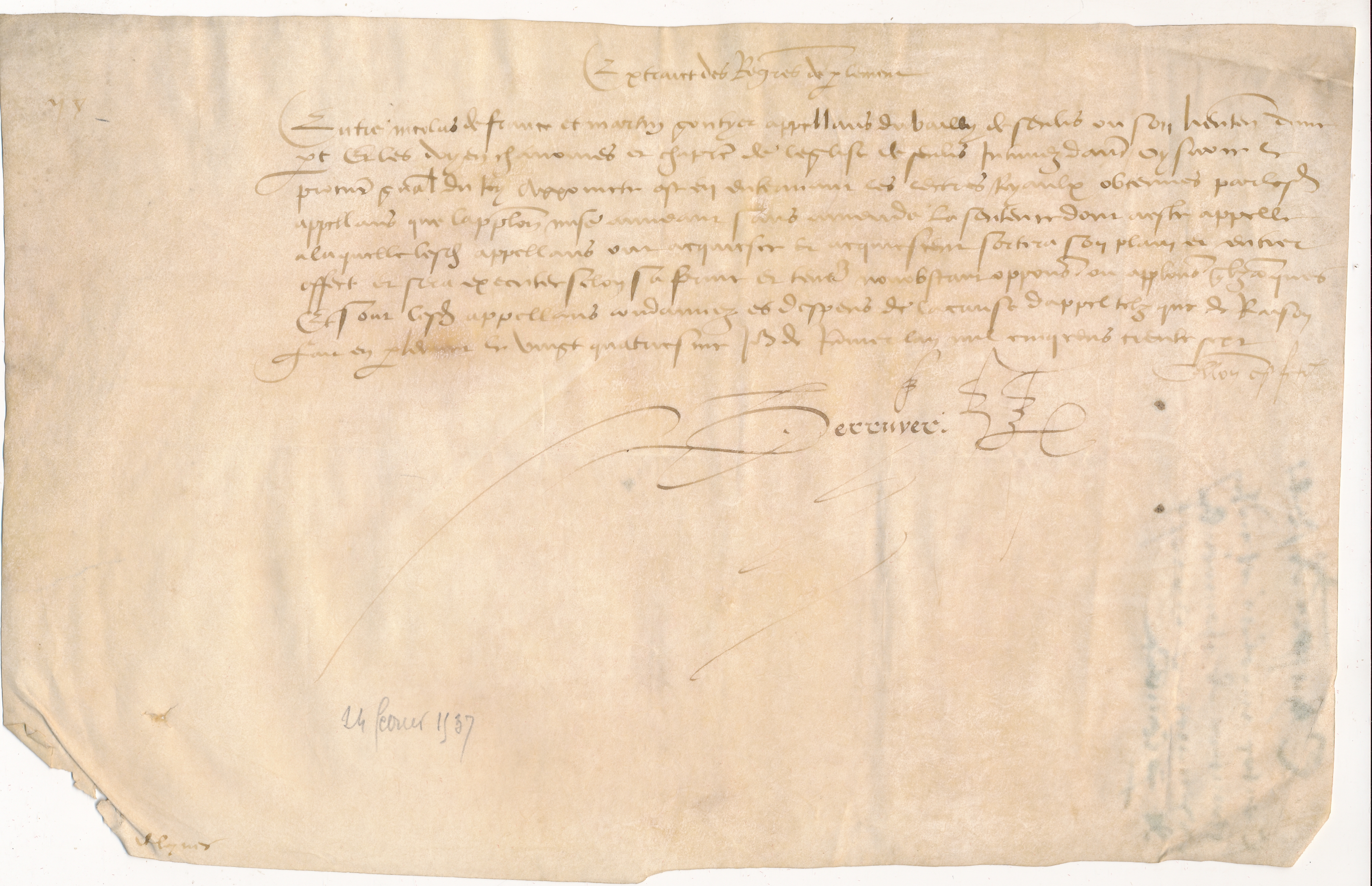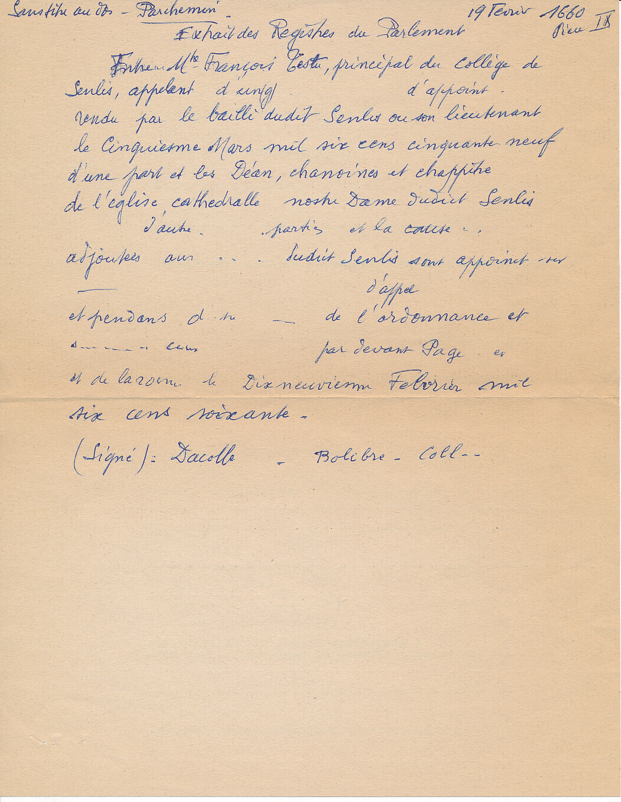 [3 - Thèmes locaux] Noms communs ou Sujets:C... (Camp à Cyclisme):Cathédrales:Notre-Dame de Senlis:Administration temporelle et spirituelleType de ressource : Archives relatives à l'organisation et aux activités d'une collectivité Période chronologique : 1600-1699 Permalink : ./index.php?lvl=notice_display&id=22324 Jugement extrait des registres du parlement entre François Testu, principal du Collège de Senlis, appelant d'un jugement d'appoint rendu par le bailli dudit Senlis ou son lieutenant le cinquiesme mars mil six cens cinquante neuf, contre les doyens, chanoines et chapitre de l'église de Senlis [texte manuscrit ou tapuscrit] / Léon Dautheuil (1899-1977), Annotateur ; Chapitre de l'église Notre Dame (Senlis), Nom associé ; François Testu (16..-16..), Nom associé . - 1660 (02-19) . - Parchemin manuscrit (1 f.) ; 16 x 22 cm + papier manuscrit (1 f.).