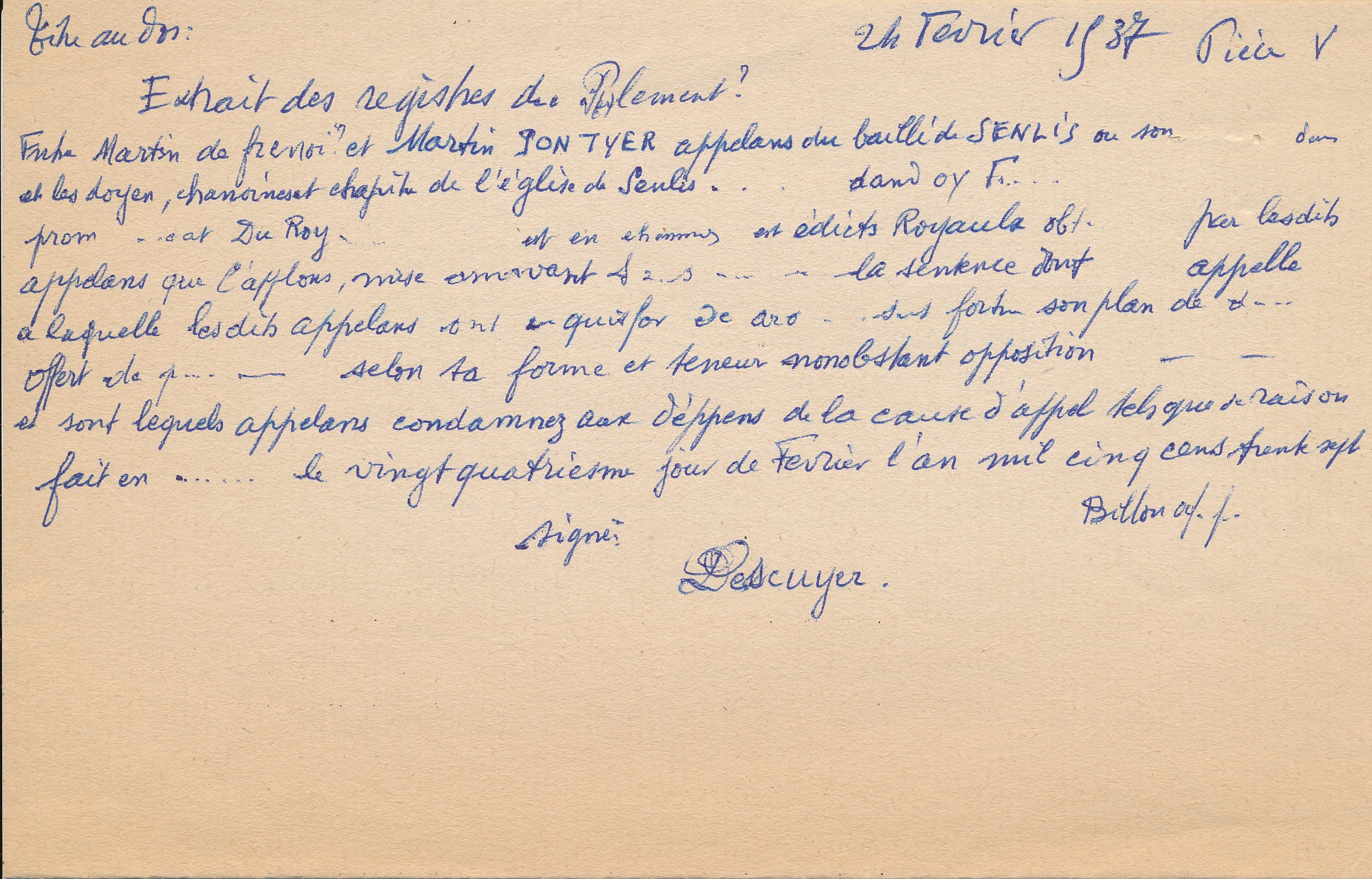 Notes ms du Dr. DautheuilURLJugement extrait des registres du parlement entre Martin de Frenoi [?] et Martin Pontye [?] appelans du bailli de Senlis, contre les doyens, chanoines et chapitre de l'église de Senlis / Léon Dautheuil (1537 (02-24))