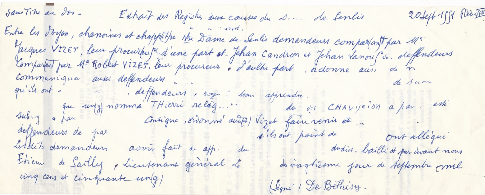 Notes ms du Dr. DautheuilURLJugement extrait des registres aux causes [...] de Senlis entre les doyens, chanoines et chapitre de Notre Dame de Senlis contre Jehan Candron et Jehan Lanouf (?) / Léon Dautheuil (1551 (09-20))