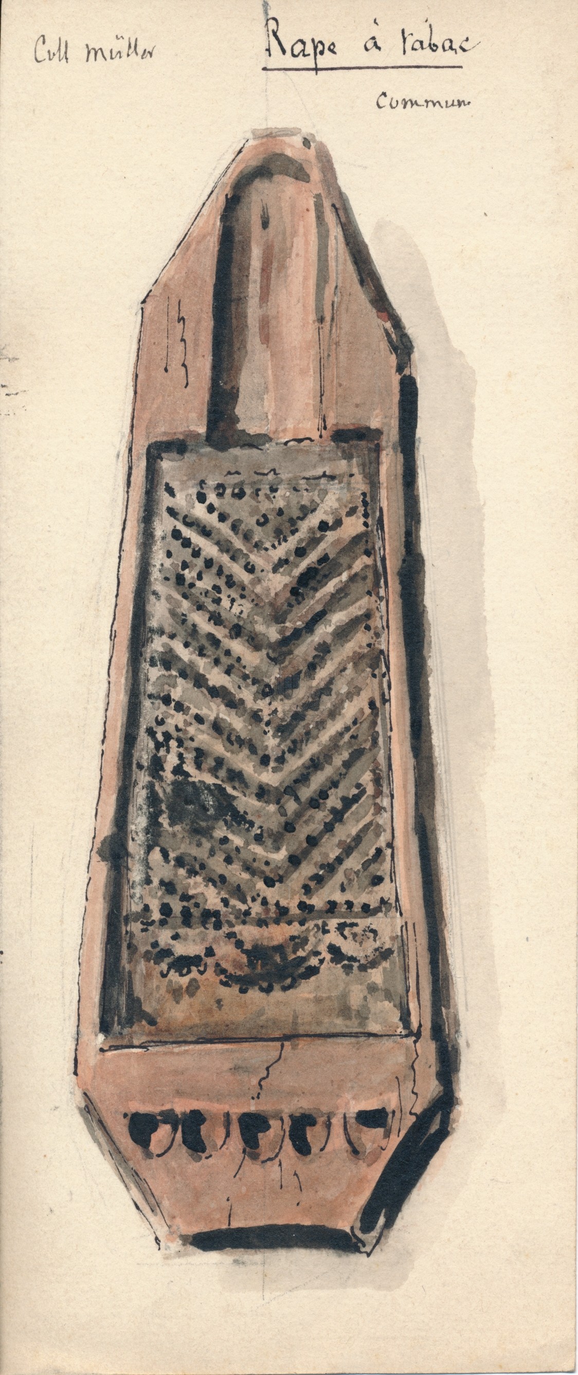 Titre de série : Collection Müller Titre : Rape à tabac Type de document : document graphique à deux dimensions Auteurs et Fonctions : Eugène Müller (1834-1918), Illustrateur Année de publication : [s.d. (avt 1914)] Importance : 1 dessin aquarellé sur papier fort Illustrations : ill. en coul. Format : 22.5 x 9.5 cm Langues : Français (fre) Index. décimale : 688.4 Fabrication des articles pour fumeurs (articles pour le tabac à chiquer ou à fumer, blagues, râpes, briquets, cendriers, étuis à cigarettes, matériel du fumeur, narguilés, porte-cigarettes, substituts du tabac) Forme de la ressource : Peinture Permalink : ./index.php?lvl=notice_display&id=20393 Collection Müller. Rape à tabac [document graphique à deux dimensions] / Eugène Müller (1834-1918), Illustrateur . - [s.d. (avt 1914)] . - 1 dessin aquarellé sur papier fort : ill. en coul. ; 22.5 x 9.5 cm.