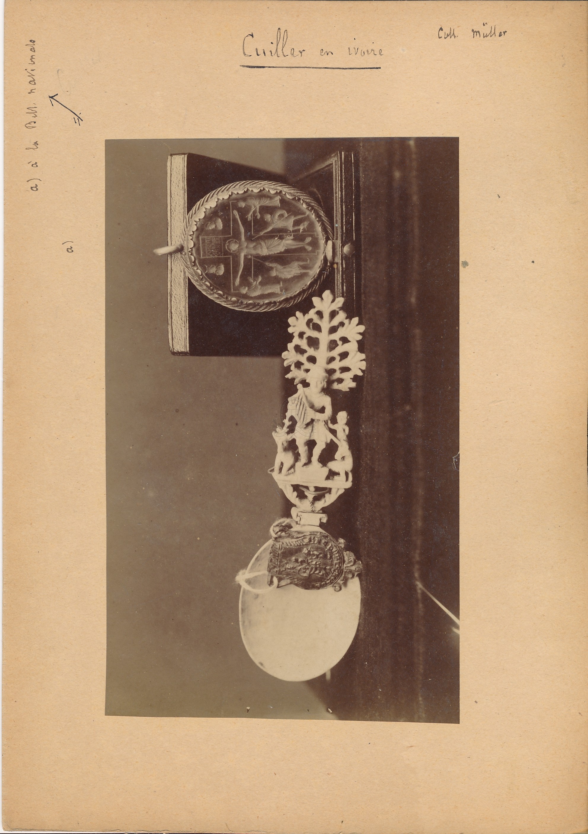 Le médaillon représente un Christ en croix ; il ferait partie des collections de la BNFLangues : Français (fre) Sujets : [1 - Thésaurus UNESCO ] Culture:Histoire:Archéologie:Objet archéologique Index. décimale : 736.6 Sculpture de la corne, de l'ambre, de l'ivoire, de l'os, des coquillages Forme de la ressource : Epreuve photographique Permalink : ./index.php?lvl=notice_display&id=20467 Collection Müller. Cuiller en ivoire et médaillon dans son coffret [document graphique à deux dimensions] / Eugène Müller (1834-1918), Photographe . - [s.d. (avt 1914)] . - 1 épreuve photographique sur papier contrecollée sur carton : ill. en noir et blanc ; 16.5 x 10 cm (24 x 17 cm).