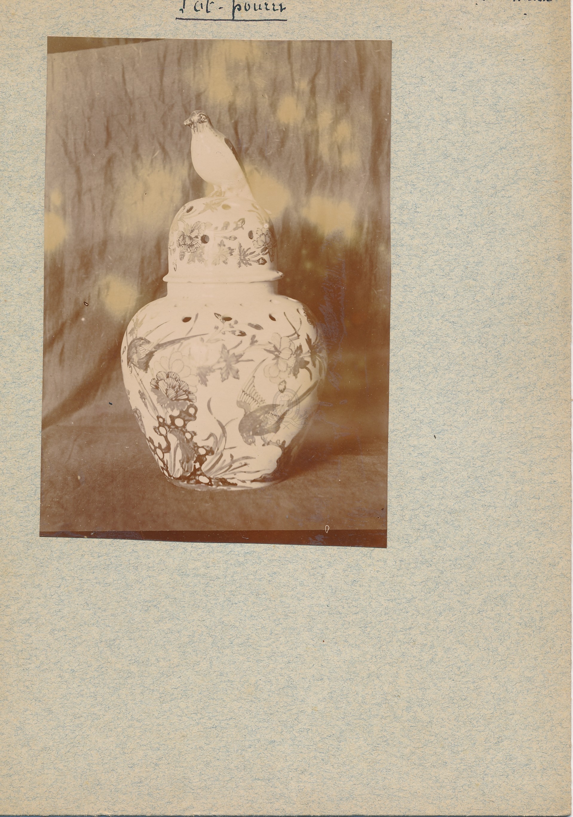 Titre de série : Collection Müller Titre : Porcelaine pot-pourri Type de document : document graphique à deux dimensions Auteurs et Fonctions : Eugène Müller (1834-1918), Photographe Année de publication : [s.d. (avt 1914)] Importance : 1 épreuve photographique sur papier contrecollée sur carton Illustrations : ill. en noir et blanc Format : 14 x 10 cm (24 x 17 cm) Langues : Français (fre) Sujets : [1 - Thésaurus UNESCO ] Politique, droit, économie:Matériaux et produits:Matériaux de construction:Céramique Index. décimale : 738.2 Porcelaine Forme de la ressource : Epreuve photographique Permalink : ./index.php?lvl=notice_display&id=20455 Collection Müller. Porcelaine pot-pourri [document graphique à deux dimensions] / Eugène Müller (1834-1918), Photographe . - [s.d. (avt 1914)] . - 1 épreuve photographique sur papier contrecollée sur carton : ill. en noir et blanc ; 14 x 10 cm (24 x 17 cm).