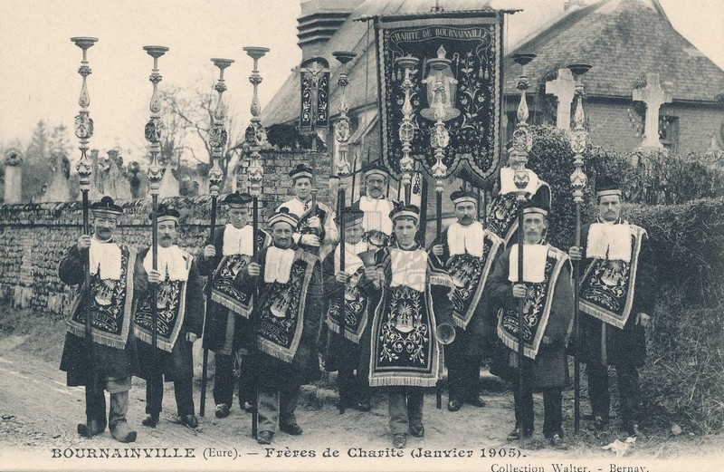 Titre de série : Bournainville (Eure) Titre : Frères de charité (janvier 1905) Type de document : document graphique à deux dimensions Editeur : Bernay : Walter Année de publication : [s.d. (avt 1914)] Collection : Collection Walter Importance : 1 carte postale Illustrations : noir et blanc Format : 9x14 cm Langues : Français (fre) Sujets : [1 - Thésaurus UNESCO ] Culture:Politique culturelle et planification de la culture:Patrimoine culturel immatériel :Coutumes et traditions :Coutume et rite funéraire