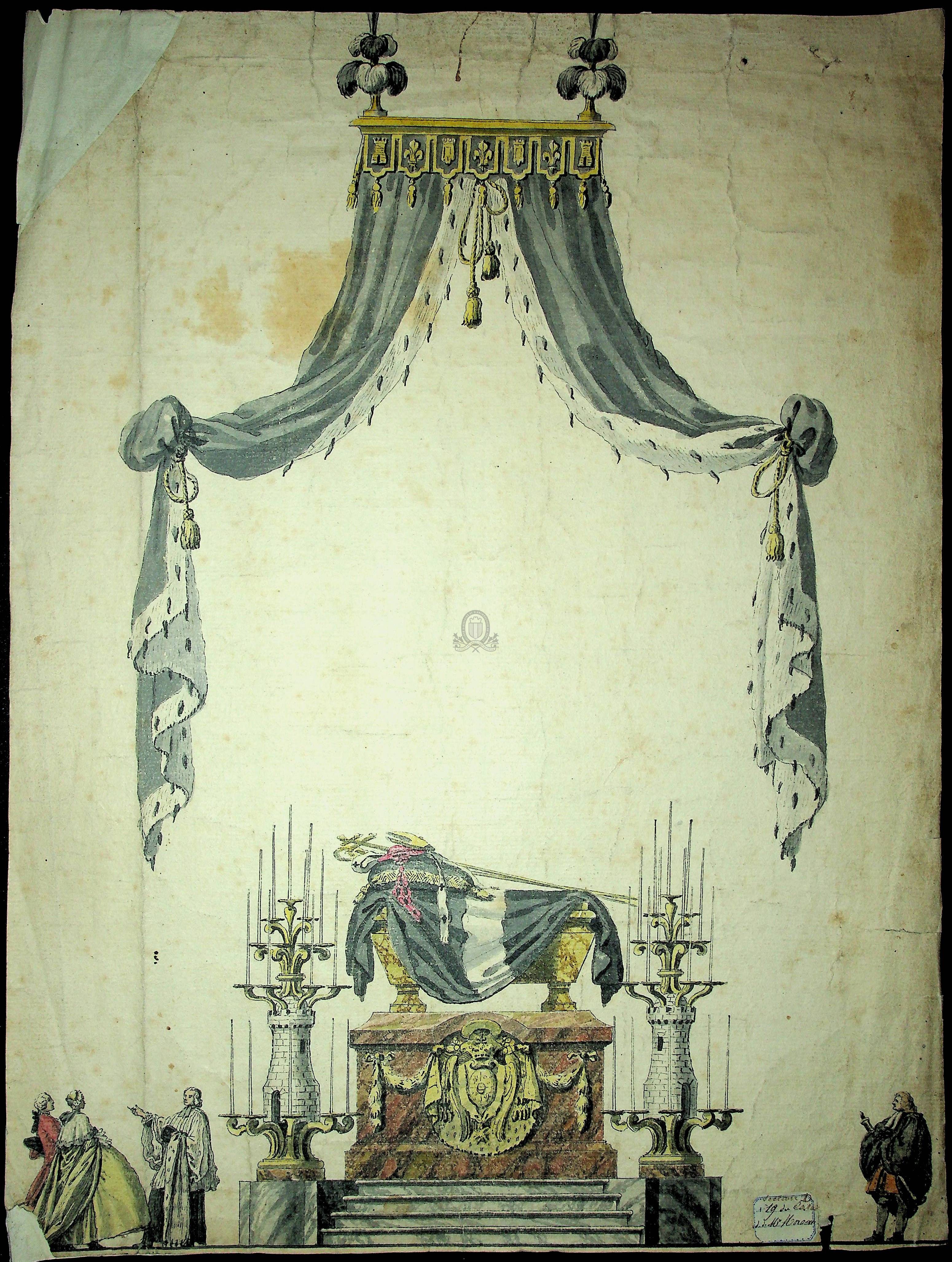 Exclu du prêtCatafalque couvert d'un dais de tissus portant en décor des tours et des fleurs de lys ([s.d. (18e siècle ?)])
