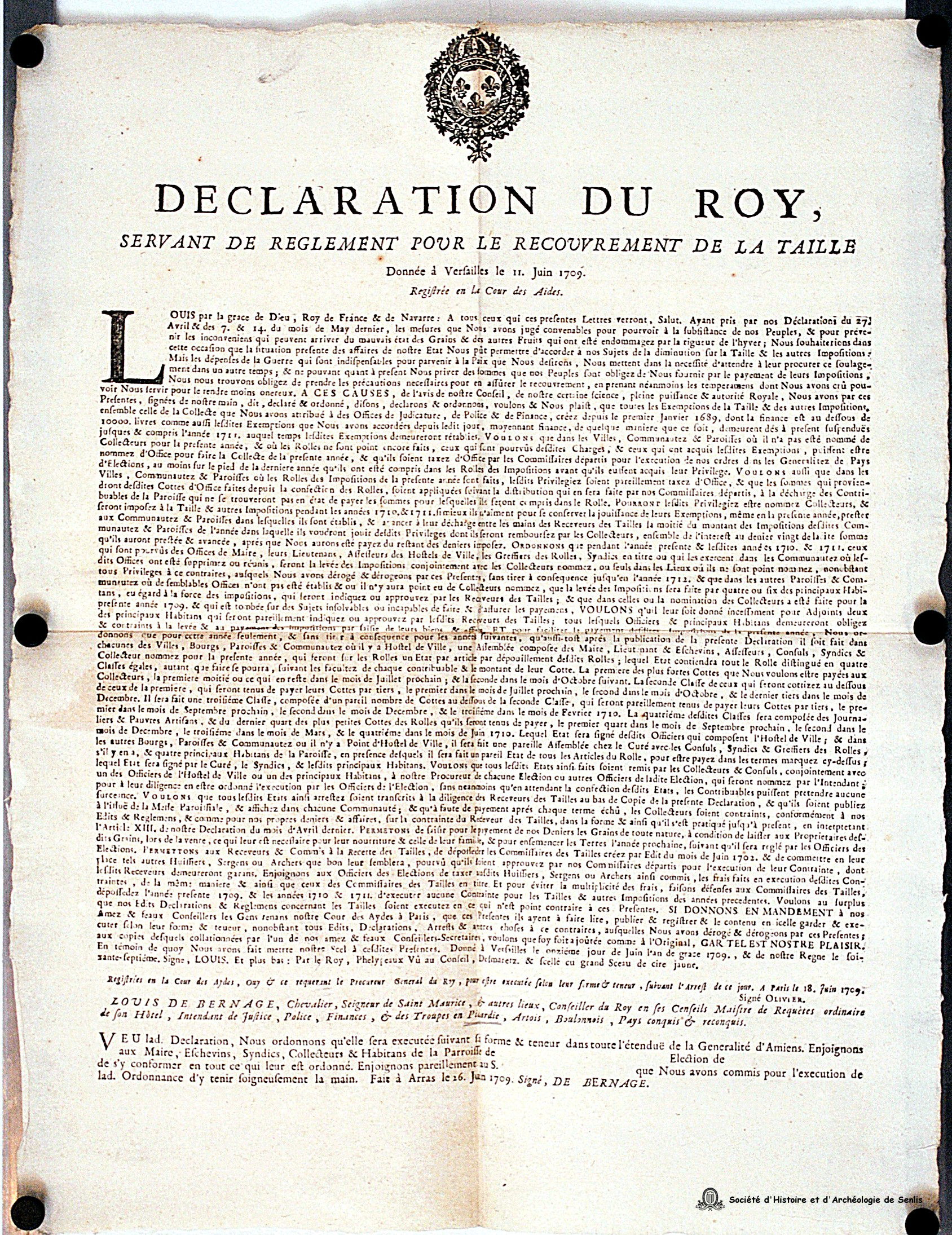 Arrêt est suivi de l'ordonnance donné à Amiens en février 1713 et signé par Louis de Bernage