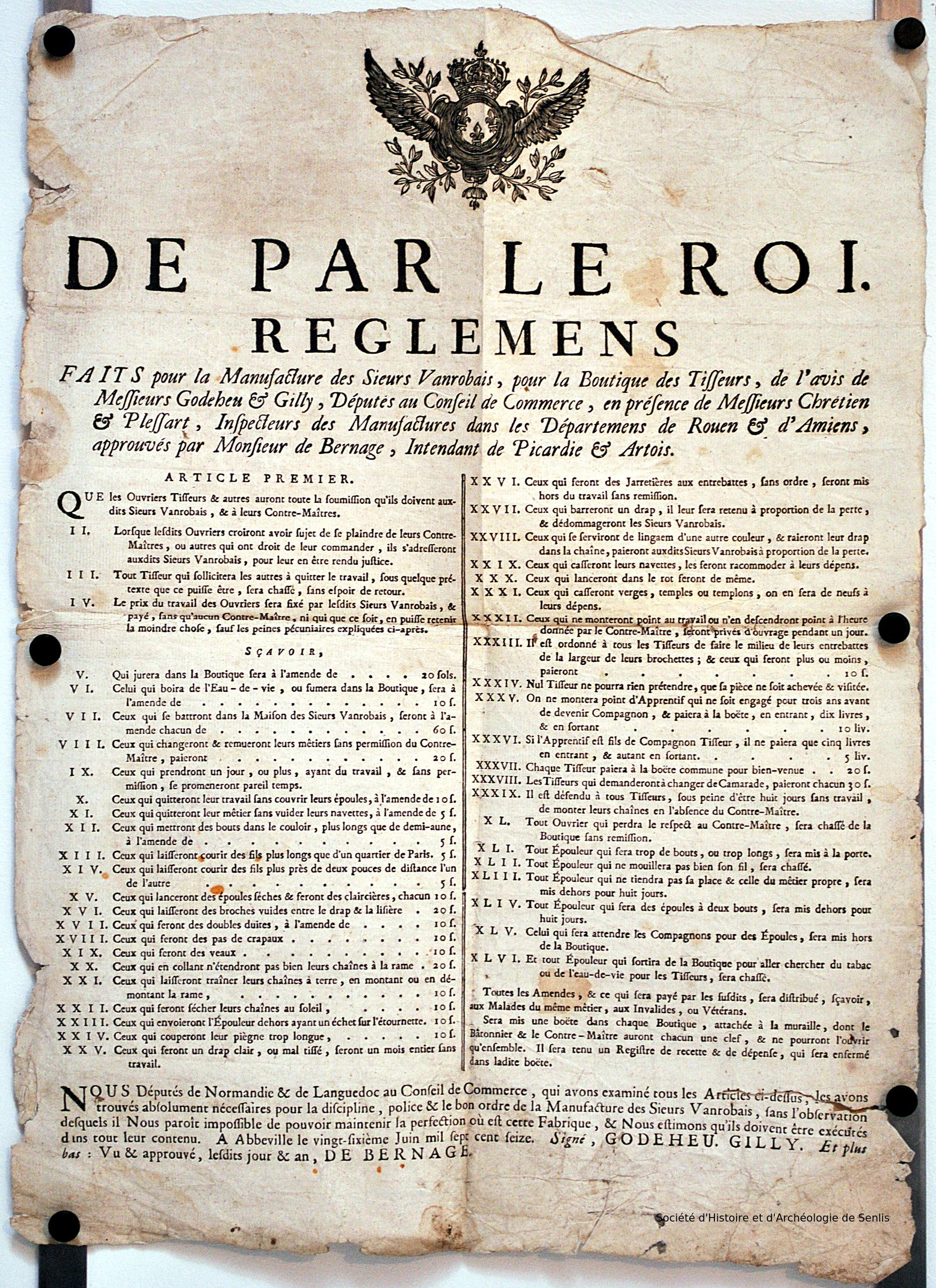 Déclaration du Roy, servant de réglement pour le recouvrement de la tailleURLDe par le Roi. Réglemens faits pour la manufacture des sieurs Vanrobais, pour la boutique des tisseurs, [...] ([s.d. (1716)])