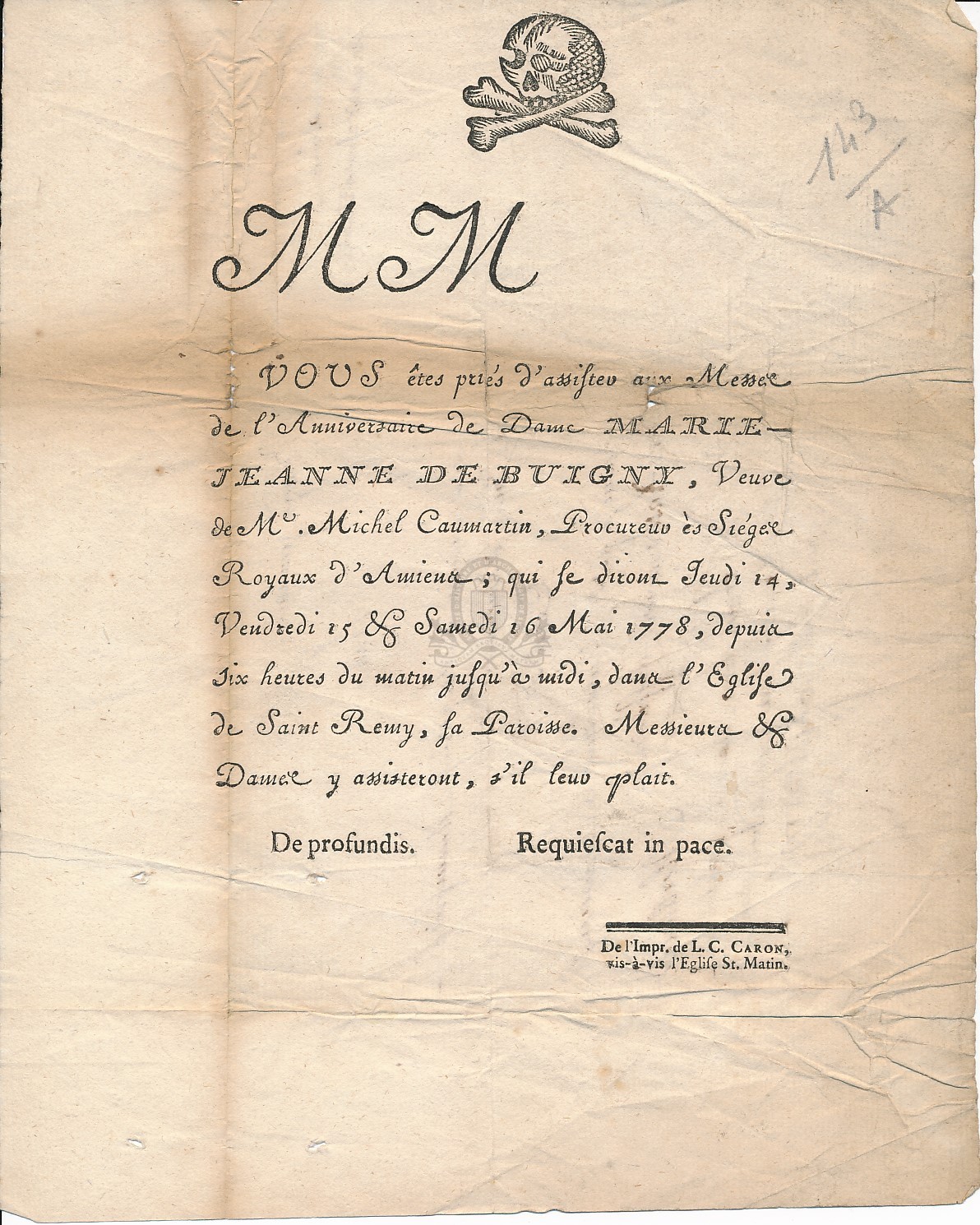 Exclu du prêtVous êtes priés d'assister aux messes de l'anniversaire de Dame Marie-Jeanne de Buigny, veuve de Me Michel Caumartin [...] ; qui se diront jeudi 14, vendredi 15 & samedi 16 mai 1778, [...] dans l'église de Saint Remy [...] (1778)
