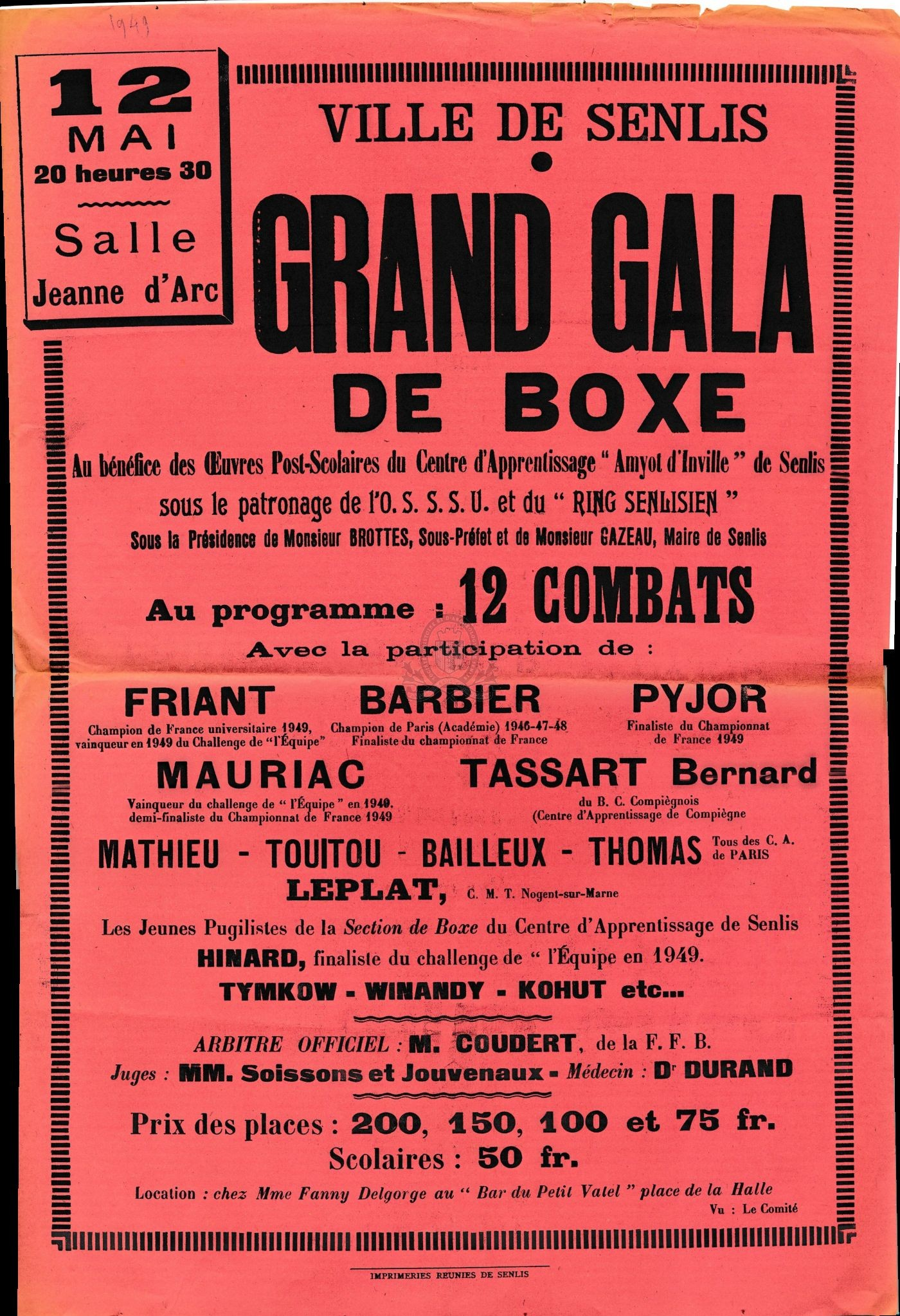 Titre : Grand gala de boxe : 12 mai [1949] salle Jeanne d'Arc Type de document : texte imprimé Auteurs et Fonctions : Ville de Senlis, Organisateur de réunion ; Centre Amyot d'Inville, Nom associé Editeur : Senlis : Imprimeries Réunies Année de publication : [s.d. (1949)] Importance : 1 affiche Format : 60 x 40 cm Accompagnement : 1 bandeau (15 x 40 cm) Note générale : Au bénéfice des oeuvres post-scolaires du Centre d'apprentissage "Amyot d'Inville" de Senlis, sous le patronage de l'O.S.S.S.U. et du Ring senlisien, sous la présidence de Monsieur Brottes, sous-préfet et de monsieur Gazeau, maire de Senlis.