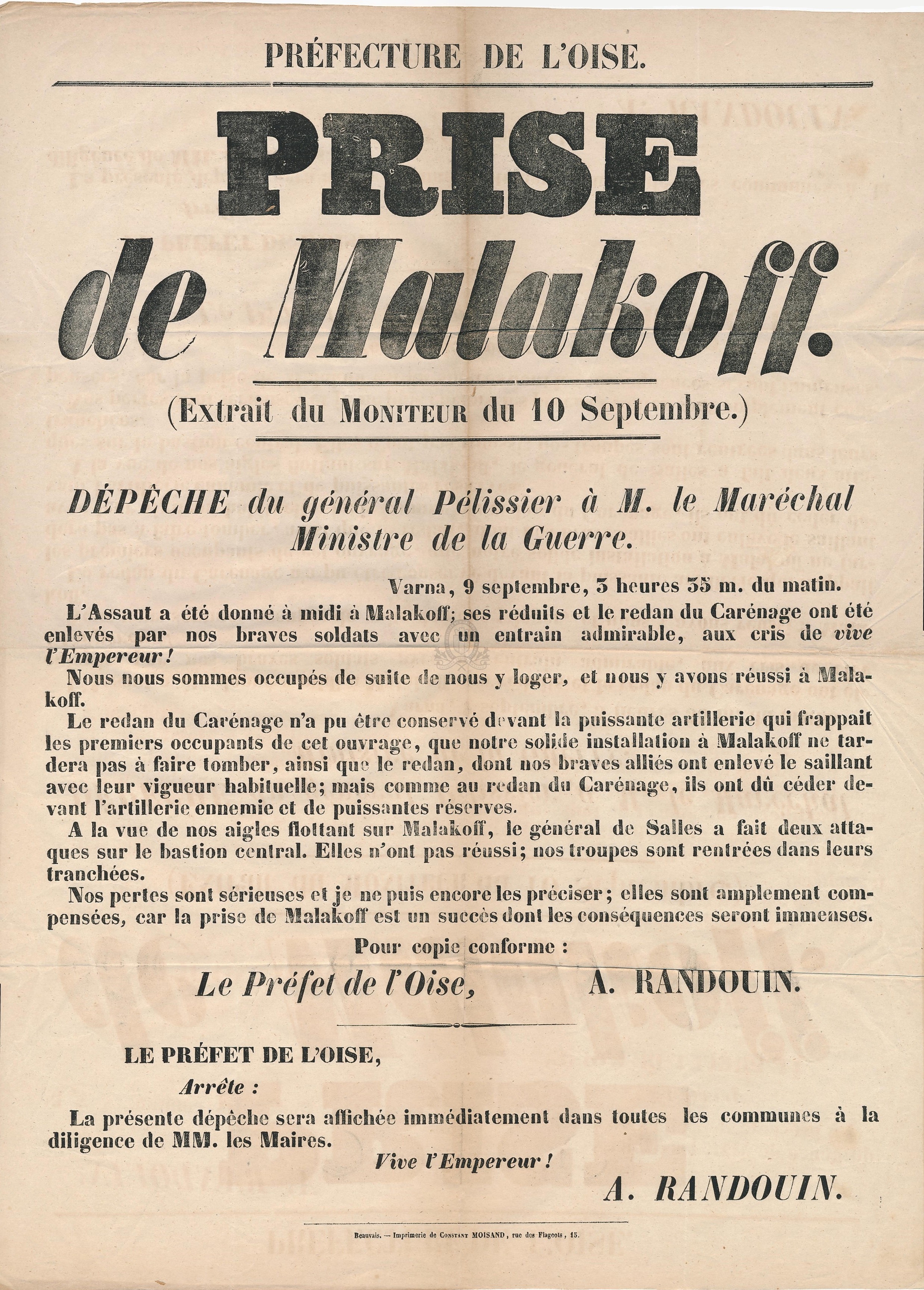 Titre : Prise de Malakoff : dépêche du général Pélissier à M. le maréchal ministre de la guerre [placard] Type de document : texte imprimé Auteurs et Fonctions : Préfecture (Oise), Éditeur scientifique ; Aimable Jean Jacques Pélissier (1794-1864) , Auteur ; Androphile dit André Randouin (1795-1871), Signataire