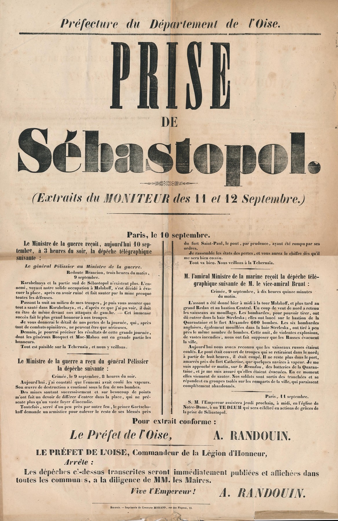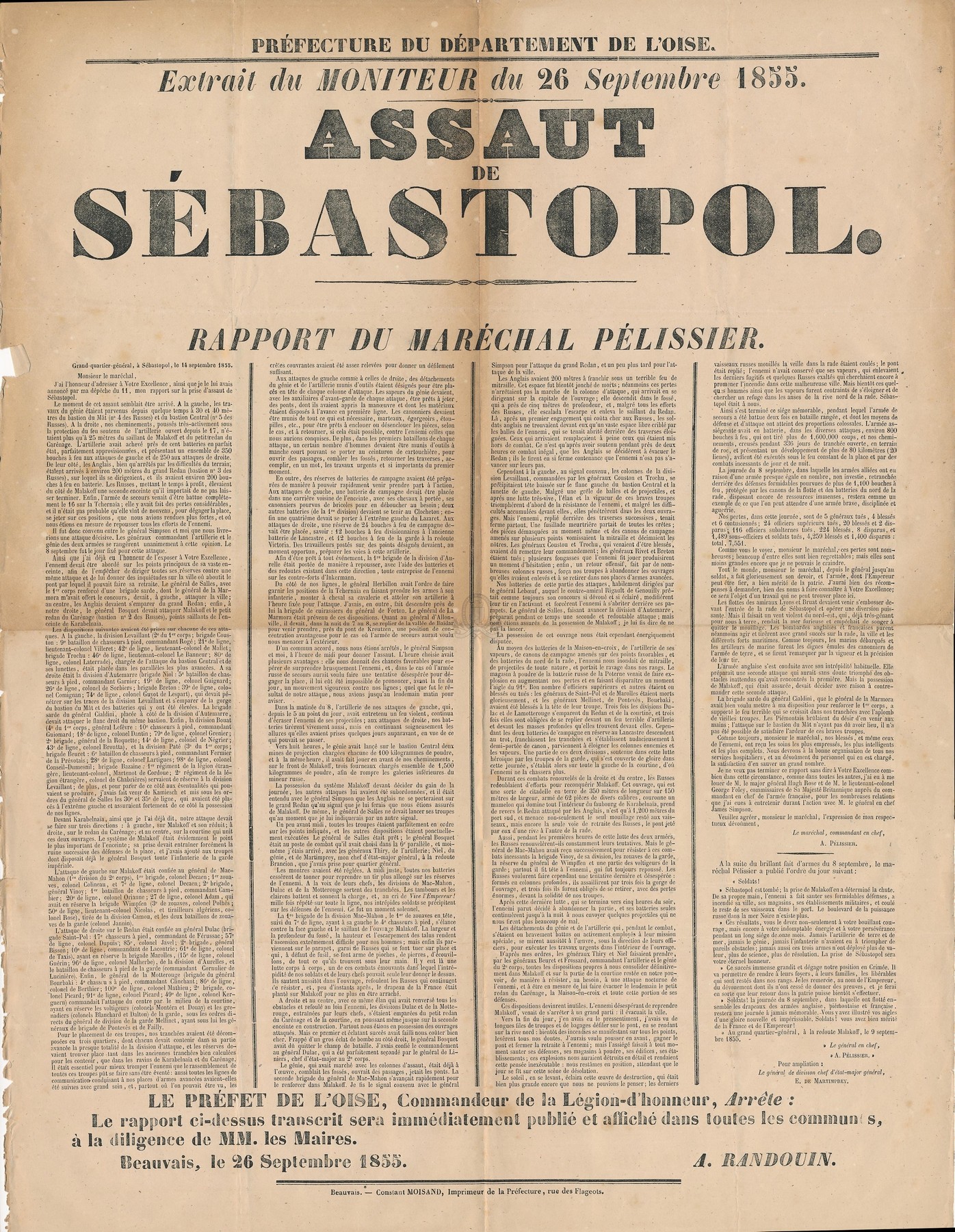Titre : Assaut de Sébastopol : rapport du maréchal Pélissier [placard] Type de document : texte imprimé Auteurs et Fonctions : Préfecture (Oise), Éditeur scientifique ; Aimable Jean Jacques Pélissier (1794-1864) , Auteur ; Androphile dit André Randouin (1795-1871), Signataire