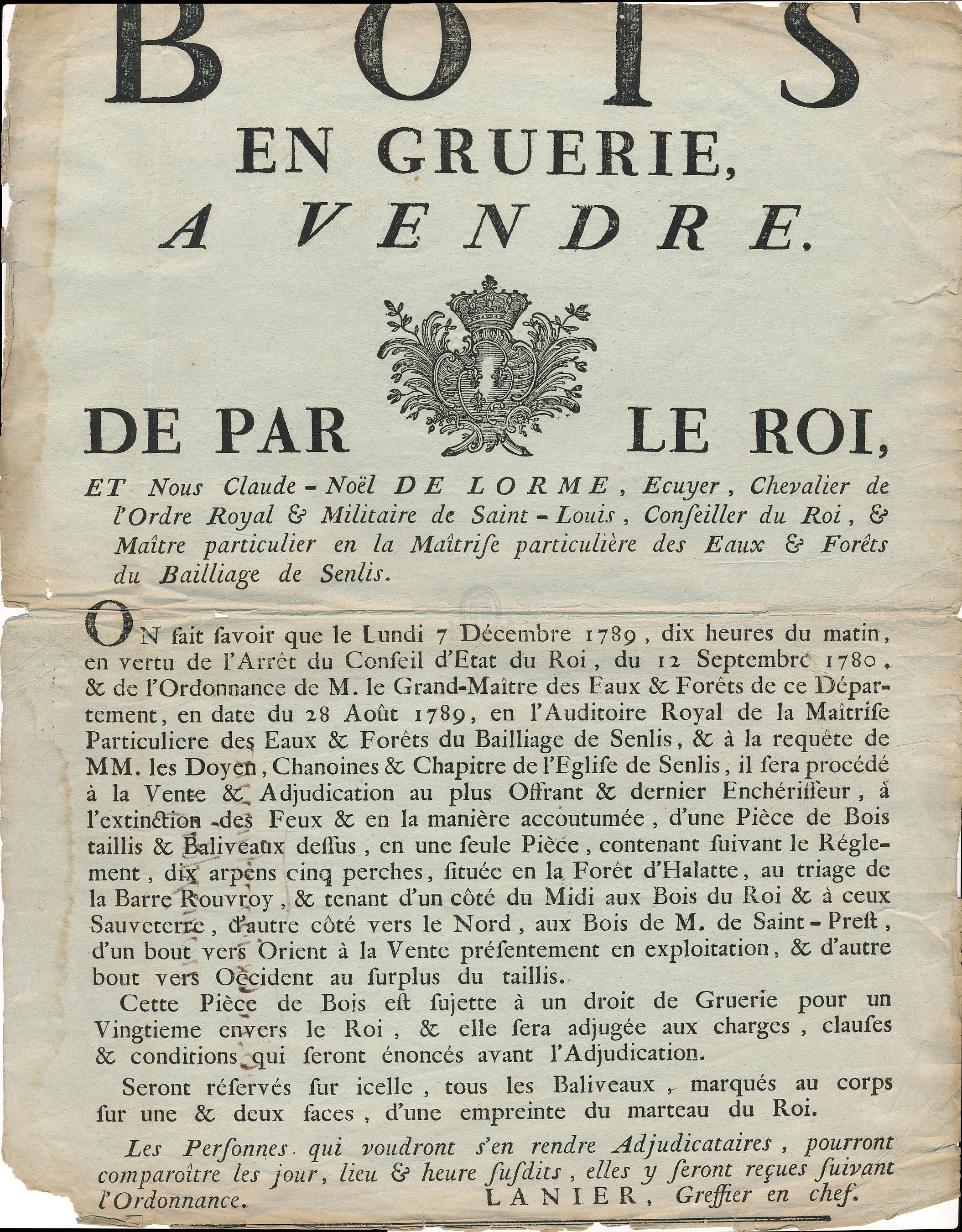 Biens à vendre sur le terroir de ChamecyURLBois en gruerie, à vendre. De par le Roi, et nous Claude-Noël Delorme, [...] le lundi 7 décembre 1789, en vertu de l'arrêt du Conseil d'Etat du Roi, du 12 septembre 1780, & de l'ordonnance de M. le Grand-Maître des Eaux & Forêts de ce département, en date du 28 août 1789 [...], & à la requête de MM. les Doyen, chanoines & Chapitre de l’Église de Senlis [...] d'une pièce de bois [...] située en la forêt d'Halatte, au triage de la Barre Rouvroy [...] / Claude-Noël Delorme ([s.d. (1789)])