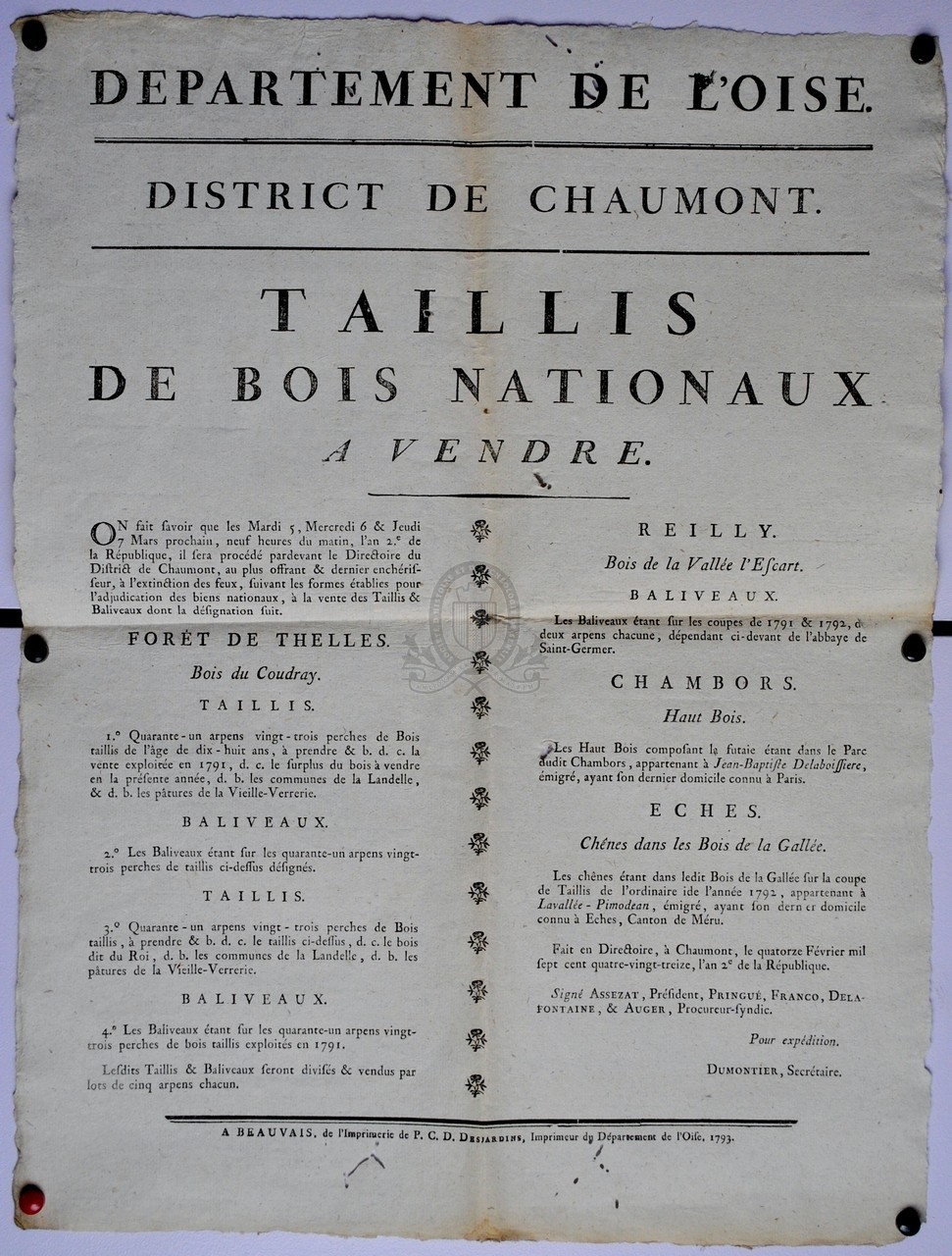 PermalinkDépartement de l'Oise. District de Chaumont. Taillis de bois nationaux à vendre / Directoire, District (1790-1800; Chaumont en Vexin) ([s.d. (1793)])
