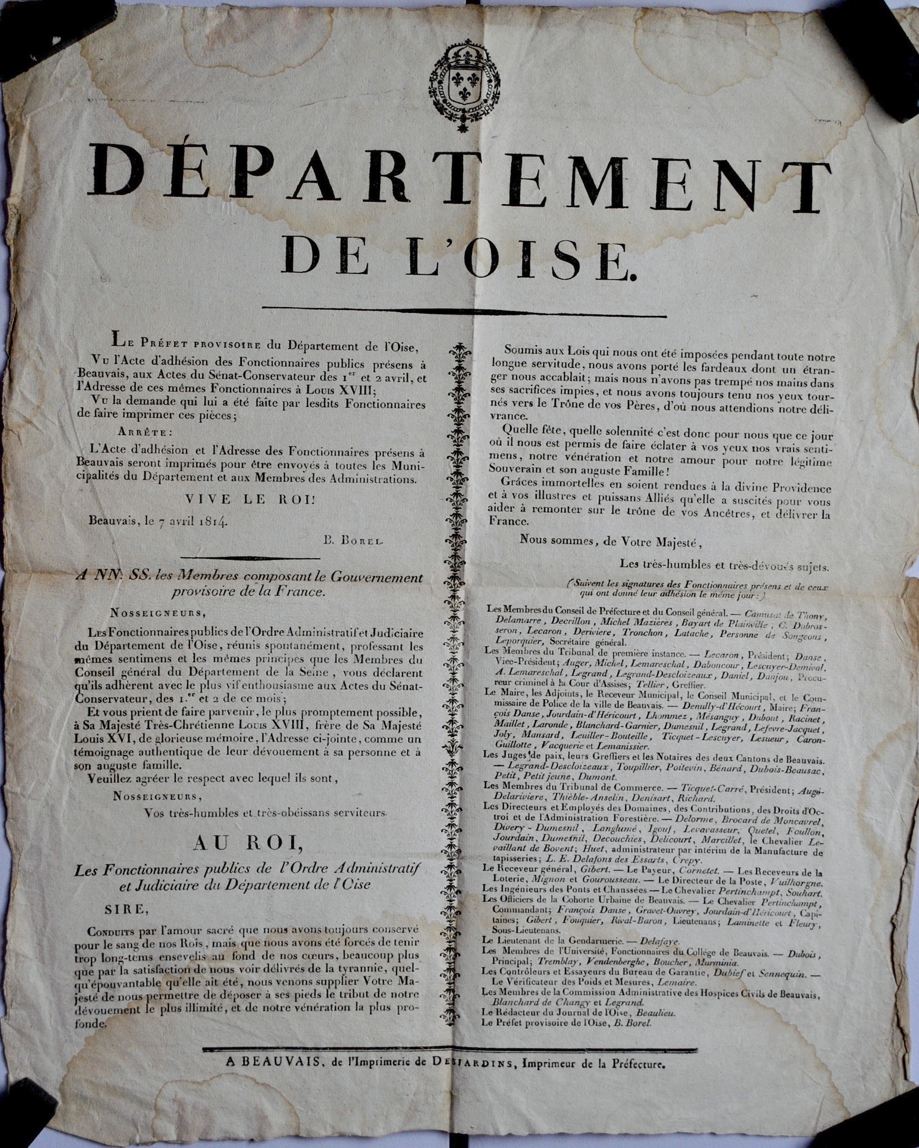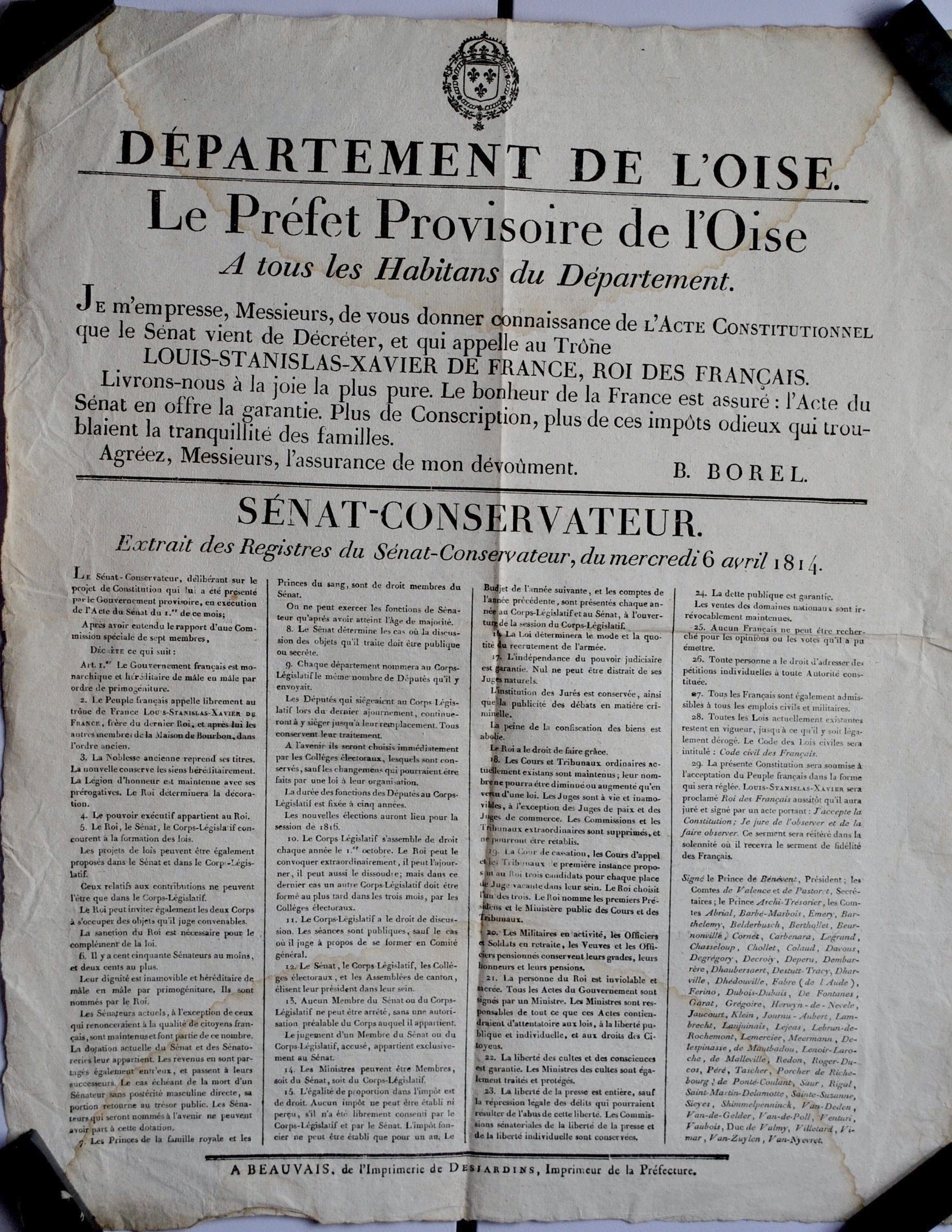 Préfet de l'Oise provisoire : B. BorelLangues : Français (fre) Sujets : [1 - Thésaurus UNESCO ] Culture:Histoire:Histoire nationale:Histoire européenne:Histoire de France:1805-1815 : Premier Empire et première Restauration Tags : Louis XVIII (roi de France, 1755-1824) Index. décimale : 944.05 Cents-jours, Premier Empire, règne de Louis XVIII, règne de Napoléon I Permalink : ./index.php?lvl=notice_display&id=3617 Département de l'Oise. Le préfet provisoire de l'Oise à tous les habitans (sic) du département. Je m'empresse, Messieurs, de vous donner connaissance de l'Acte constitutionnel que le Sénat vient de décréter, et qui appelle au Trône Louis-Stanislas-Xavier de France, Roi des Français [...] : [placard] [texte imprimé] / Oise Département, Éditeur scientifique ; Durand Borel de Brétizel (17..-1839), Signataire . - A Beauvais : De l'imprimerie de Desjardins, 1814 . - 1 f. ; 52.5 x 42 cm.