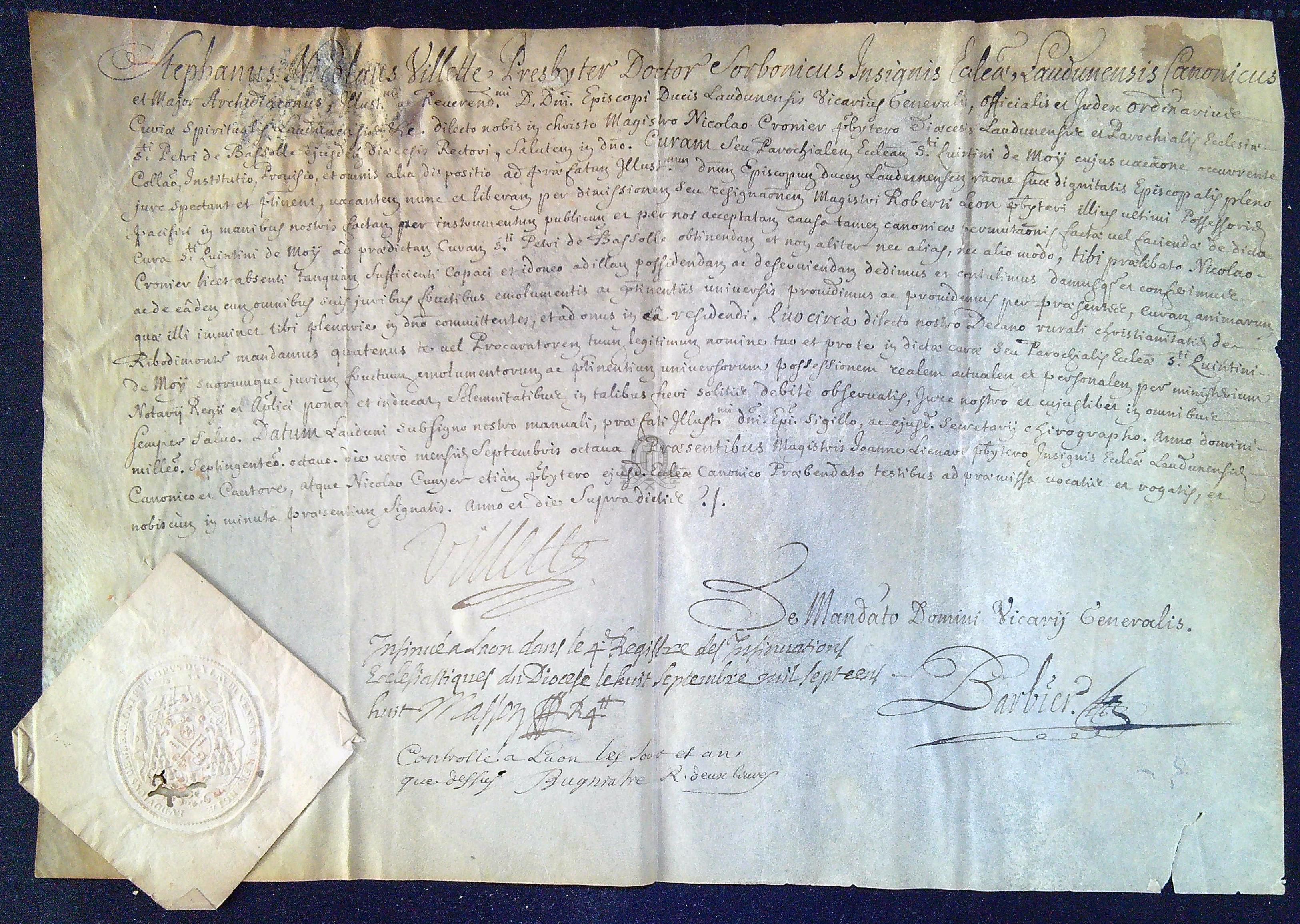 [1 - Thésaurus UNESCO ] Pays et ensembles de pays:Europe:France:Picardie (Aisne - Oise - Somme):Aisne (département)Type de ressource : Archives relatives à l'organisation et aux activités d'une collectivité Période chronologique : 1700-1799 Permalink : ./index.php?lvl=notice_display&id=14988 Etienne-Nicolas Vilette, vicaire général de l'évêque de Laon, permet à Nicolas Cronier, curé de Saint-Pierre de Bassolle, d'accepter la cure de Saint-Quentin de Moy, vacante par la démission de Robert Lion, à la condition d'y résider [texte manuscrit ou tapuscrit] / Etienne-Nicolas Villette (16..-17..), Auteur ; Eglise catholique romaine Diocèse (04..-1801; Laon), Collectivité éditrice ; Louis Annet Clermont de Chaste de Roussillon (1662-1721), Nom associé . - 1708 (09-08) . - parchemin (1 pièce manuscrite) ; 25 x 36 cm.