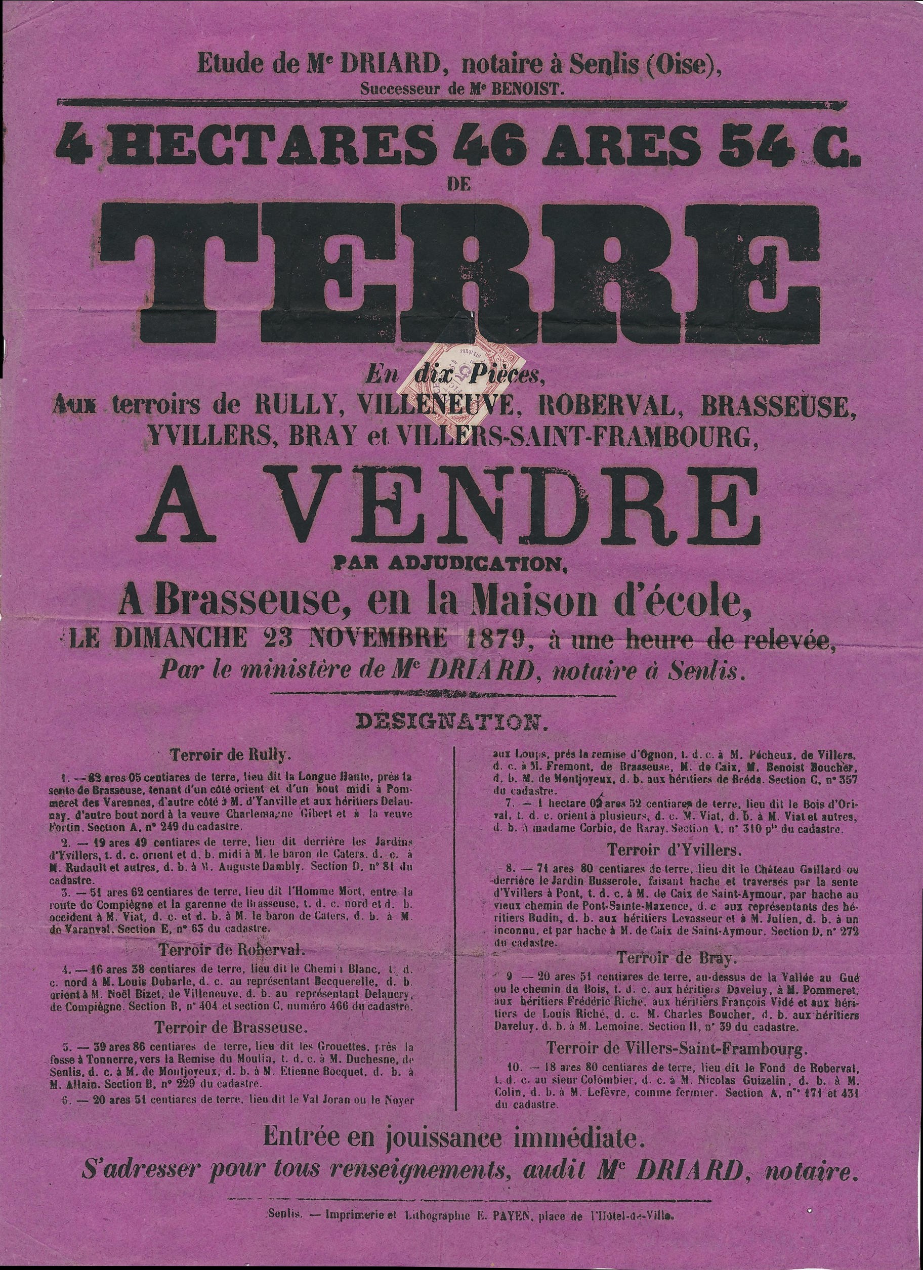 Affiner la recherche Interroger des sources externes4 hectares 46 ares 54 C. de terre en dix pièces, aux terroirs de Rully, Villeneuve, Roberval, Brasseuse, Yvillers, Bray et Villers-Saint-Frambourg, à vendre par adjudication, à Brasseuse, en la maison d'école, le dimanche 23 novembre 1879 [...] par le ministère de Me Driard, notaire à Senlis. [...] / Alfred Driard (1879)