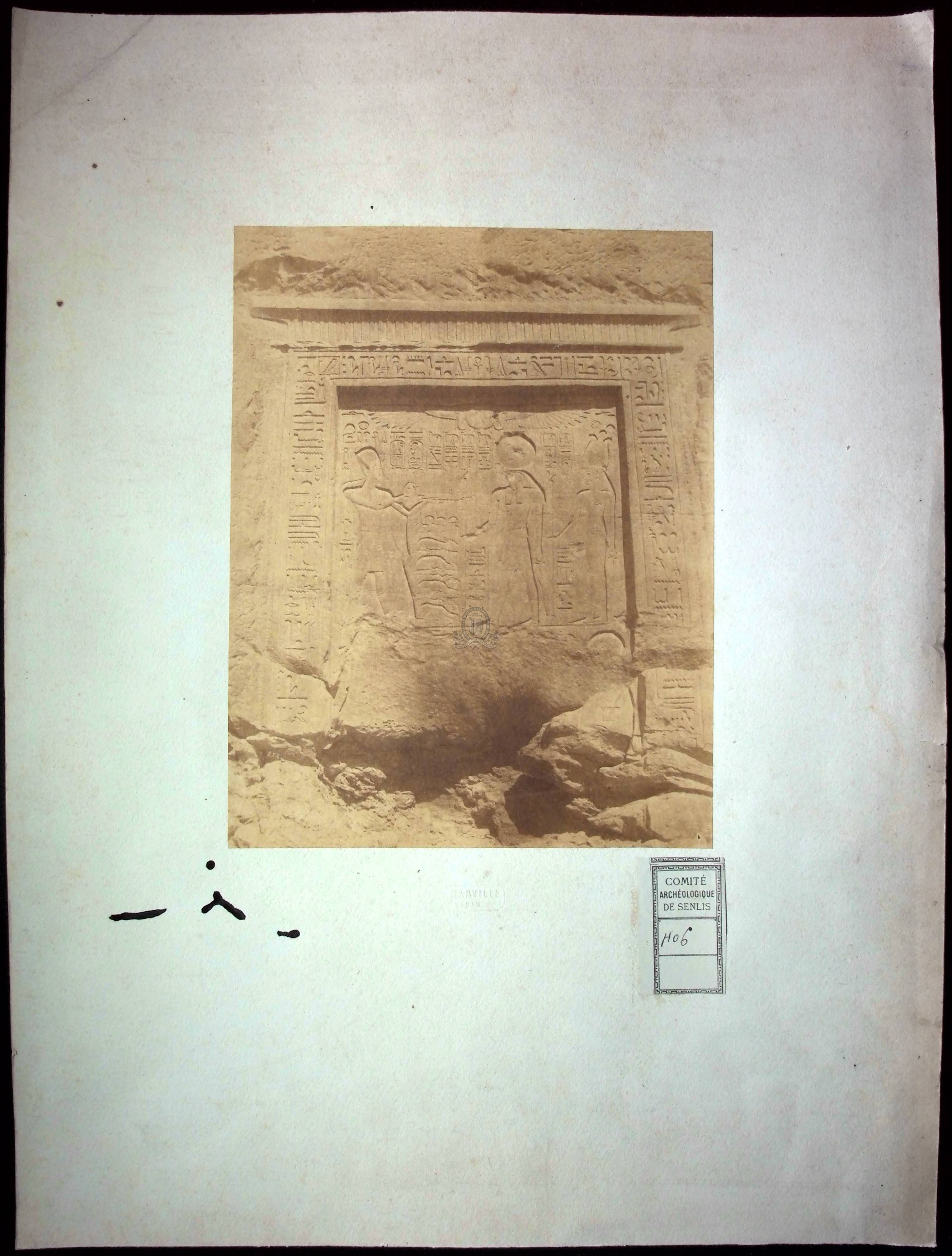 Titre : Relief de Ramses II faisant une offrande à Ra et Nekhbet Type de document : document graphique à deux dimensions Auteurs et Fonctions : Charles François Bossu, dit Marville (1813-1879) , Photographe