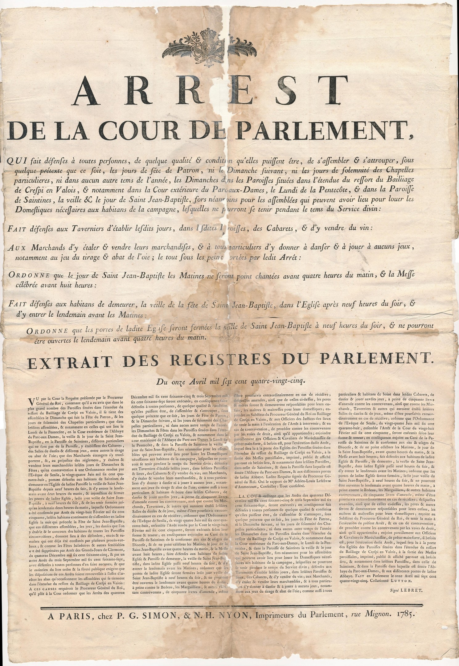 Exclu du prêtFonds Caix de St Aymour Arrest de la Cour de parlement, qui fait défenses à toutes personnes, [...], de s'assembler & s'attrouper, [...], les jours de fête de patron, ni le dimanche suivant, ni les jours de solemnité des chapelles particulières, ni dans aucun autre temps de l'année, les dimanches dans les paroisses situées dans l'étendue du ressort du bailliage de Crespi en Valois, & notamment dans la cour extérieure du Parc-aux-dames, le lundi de la Pentecôte, & dans la paroisse de Saintines, la veille & le jours de Saint-Jean-Baptiste, [...] Fait défenses aux taverniers d'établir lesdits jours, dans lesdites paroisses, des cabarets, & d'y vendre du vin ; aux marchands d'y étaler & vendre leurs marchandises, & à tous particuliers d'y donner à danser & à jouer à aucun jeux, notamment au jeu du tirage & abat de l'oie [...] / Parlement (Paris, France) (1785)