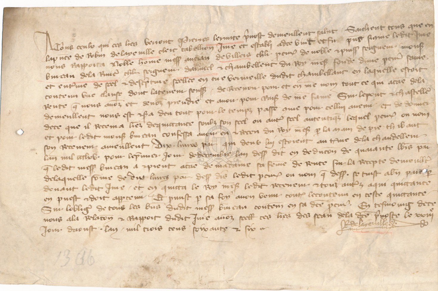 [1 - Thésaurus UNESCO ] Pays et ensembles de pays:Europe:France:Ile de France (Paris, Val d'Oise, Seine et Marne, Essonne, Yvelines)Résumé : Quittance par laquelle Anceau de Villers, agissant par procuration de Bureau de la Rivière, reconnaît avoir reçu du receveur de Meullan (Thibaut) une somme de dix livres parisis de rente due par le roi à l'épouse de Bureau de la Rivière (Maguerite d'Aunel) et gagée sur les revenus du pont et château de Meullan Type de ressource : Archives relatives aux activités et à la vie d'une ou plusieurs personnes Période chronologique : 1300-1399 Permalink : ./index.php?lvl=notice_display&id=15228 Exemplaires (1)