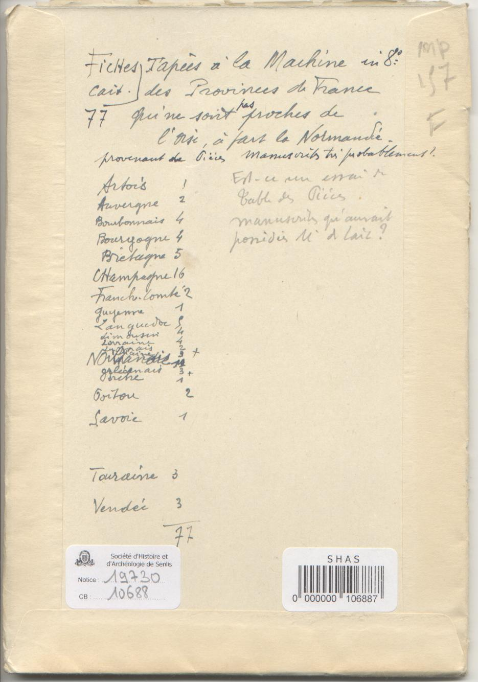 [2 - Thésaurus Brunet-Parguez ] Histoire et Sciences auxiliaires de l'histoire:Histoire moderne:Europe:Histoire de France:Histoire particulière des anciennes provinces et villes de FranceType de ressource : Archives relatives aux activités et à la vie d'une ou plusieurs personnes Période chronologique : 1500-1599/1600-1699/1700-1799 Permalink : ./index.php?lvl=notice_display&id=19730 Fiches tapuscrites reproduisant en résumé des pièces manuscrites concernant des provinces de France qui ne sont pas proches de l'Oise, à part la Normandie [texte manuscrit ou tapuscrit] / Amédée de Caix de Saint-Aymour (1843-1920), Compilateur ; Léon Dautheuil (1899-1977), Annotateur . - [s.d. (ca 1950)] . - papier pelure, 77 pièces ; 21 cm.