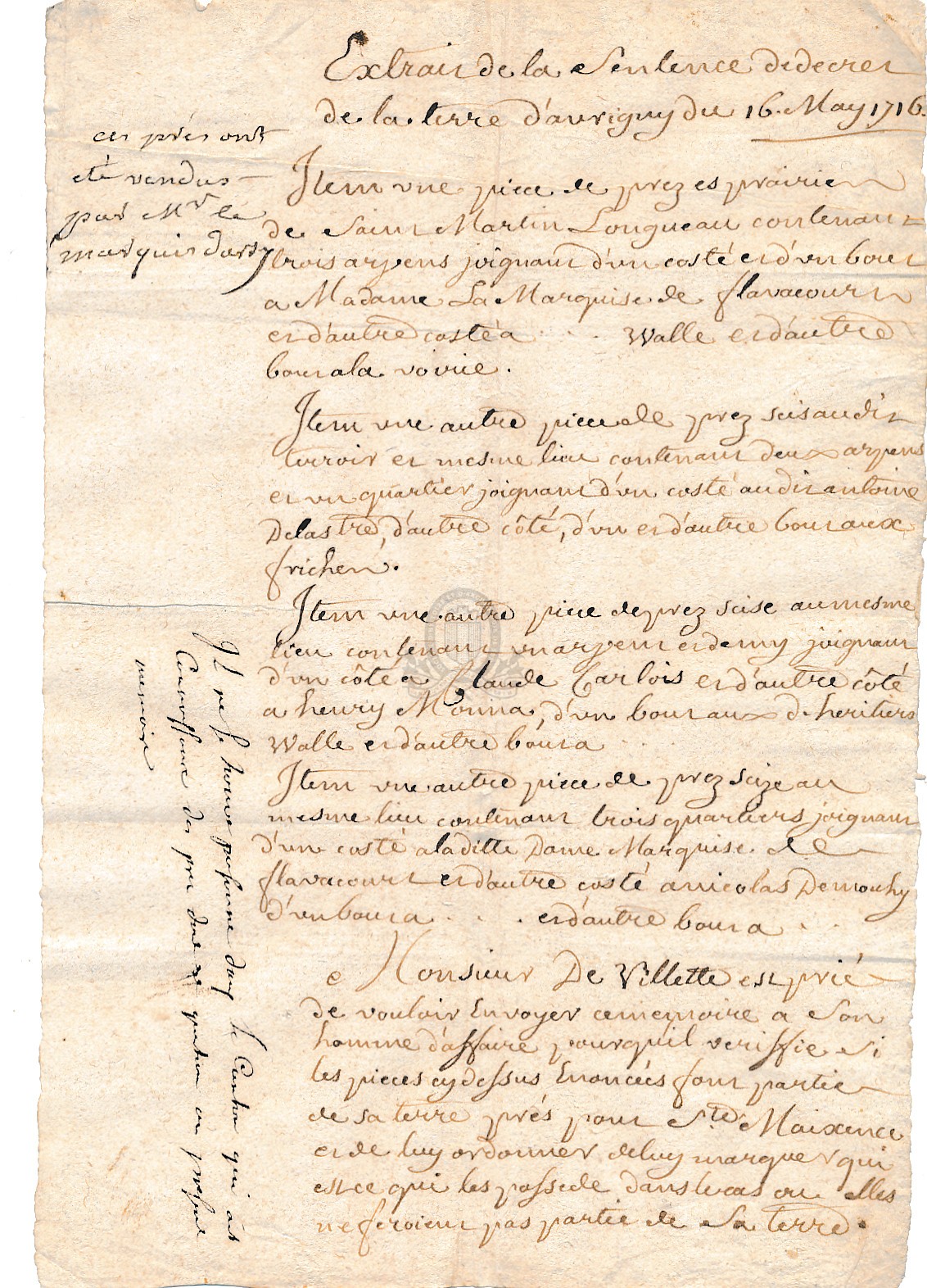 Exclu du prêtArchives Bt 228 Note adressée à Monsieur de Villette lui demandant de bien vouloir vérifier si certaines pièces de terre situées à Avrigny font bien partie de sa terre près Pont Ste Maxence ([s.d. (aps 1716)])