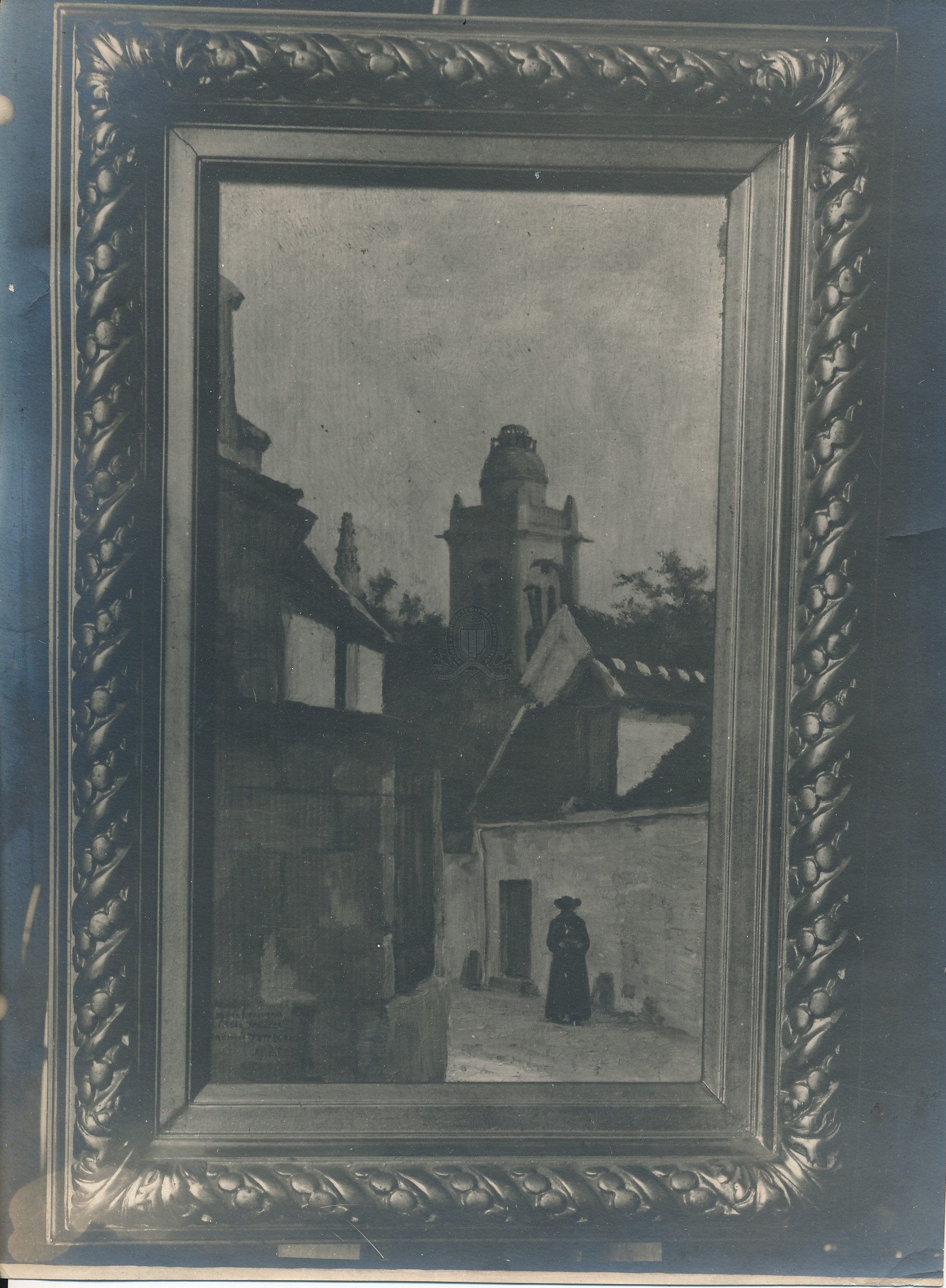 Titre de série : Collection Müller Titre : Rue des pigeons blancs à Senlis : tableau de F. Tattegrain Type de document : document graphique à deux dimensions Auteurs et Fonctions : Eugène Müller (1834-1918), Photographe ; Francis Tattegrain (1853-1915), Nom associé Année de publication : [s.d. (avt 1914)] Importance : 1 épreuve photographique sur papier Illustrations : ill. en noir et blanc Format : 19.5 x 15 cm Note générale : Mention ms au dos du cliché : Pour Marie Louise Toupet. et signature autographe d'E. Müller.