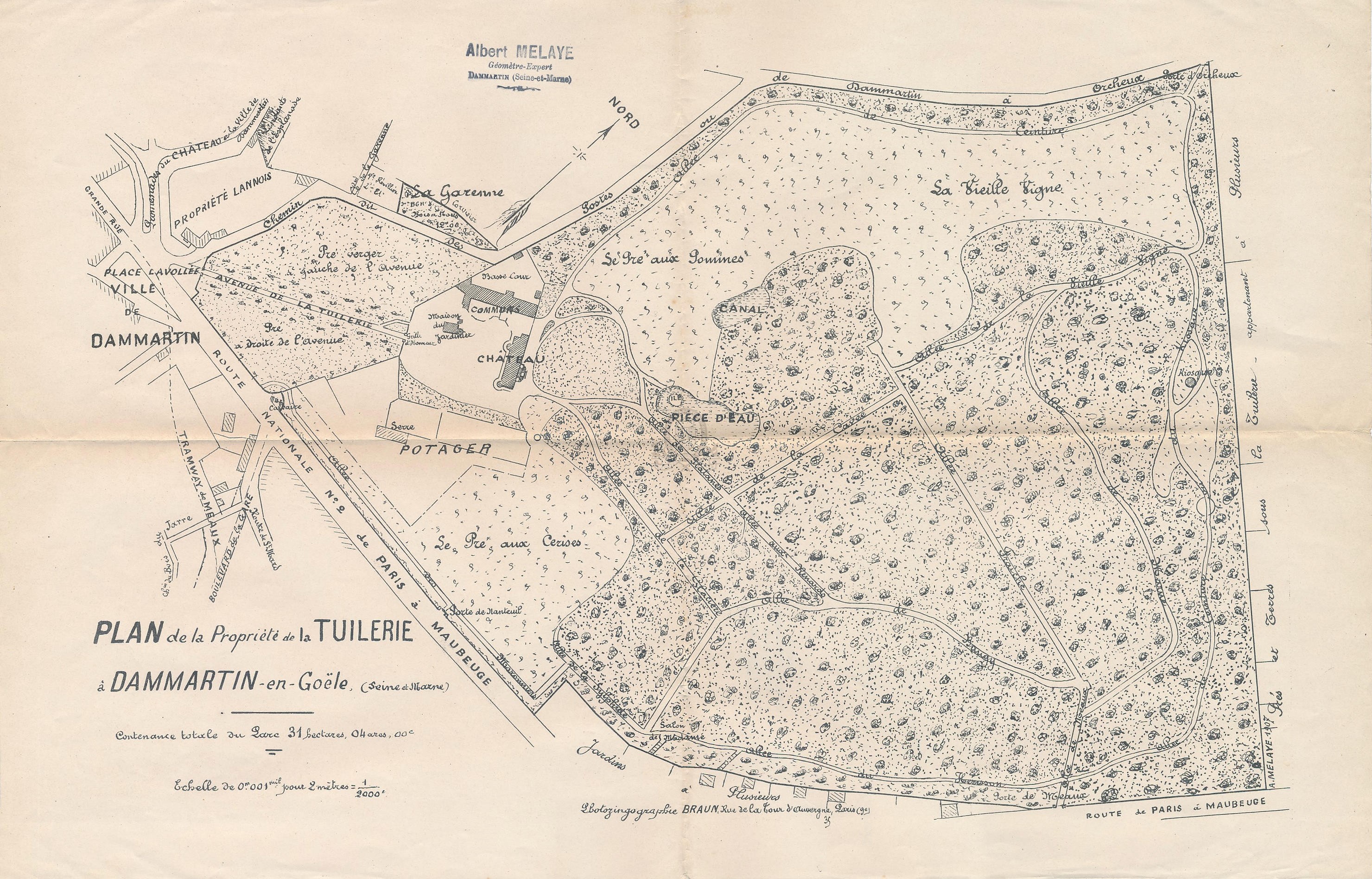 Echelle de 0.001 mil pour 2 mètresLangues : Français (fre) Permalink : ./index.php?lvl=notice_display&id=8974 Plan de la propriété de la Tuilerie à Dammartin en Goële (Seine et Marne) [document cartographique imprimé] / Albert Melaye (18..-19..), Ancien possesseur . - Paris : Braun, 1907 . - 1 f. : ill. en noir et blanc ; 33 x 50 cm.