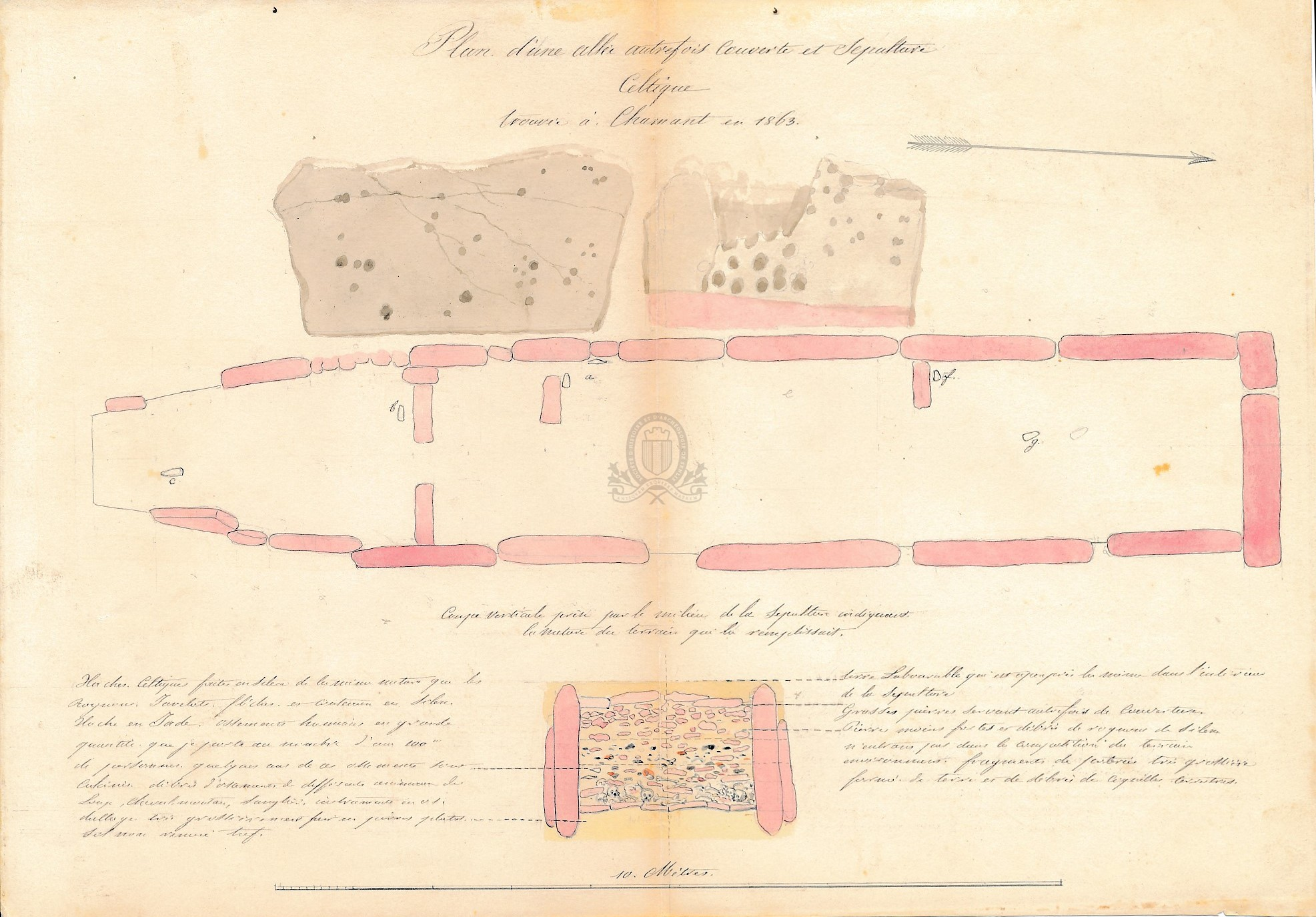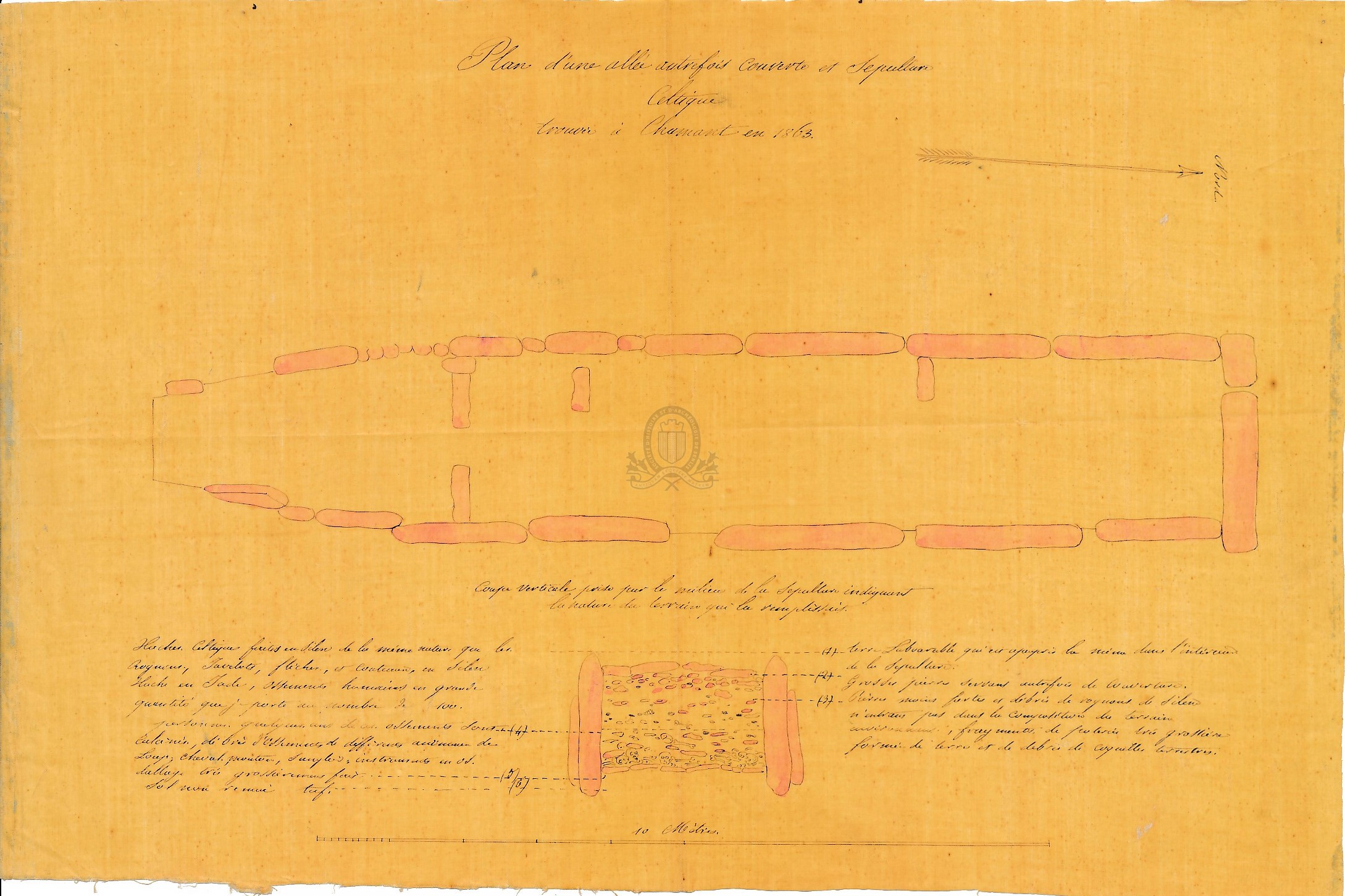 [3 - Thèmes locaux] Noms géographiques:Arrondissement et canton de Senlis (commune, canton et arrondissement):Chamant (Oise)Forme de la ressource : Dessin Permalink : ./index.php?lvl=notice_display&id=16327 Plan d'une allée autrefois couverte et sépulture celtique trouvée à Chamant en 1863 [document graphique à deux dimensions] / A. de La Vaulx (18..-....), Auteur présumé . - [1863 ?] . - Aquarelles sur papier (2 plans) : réhaussées en coul. ; 23,5 x 34 cm ; 24,5 x 37 cm + 1 pièce ms (2 ff.).