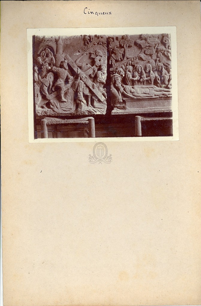 Titre : Cinqueux [église détruite - intérieur - mobilier] Type de document : document graphique à deux dimensions Année de publication : [s.d. (avt 1914)] Importance : 1 épreuve photographique sur papier contrecollée sur carton Format : 9 x 12 cm (24,5 x 16,5 cm) Note générale : Fragments de retable : chemin de croix et mise au tombeau Langues : Français (fre) Sujets : [1 - Thésaurus UNESCO ] Culture:Religion:Édifice religieux:Église (édifice) - Chapelle - Collégiale