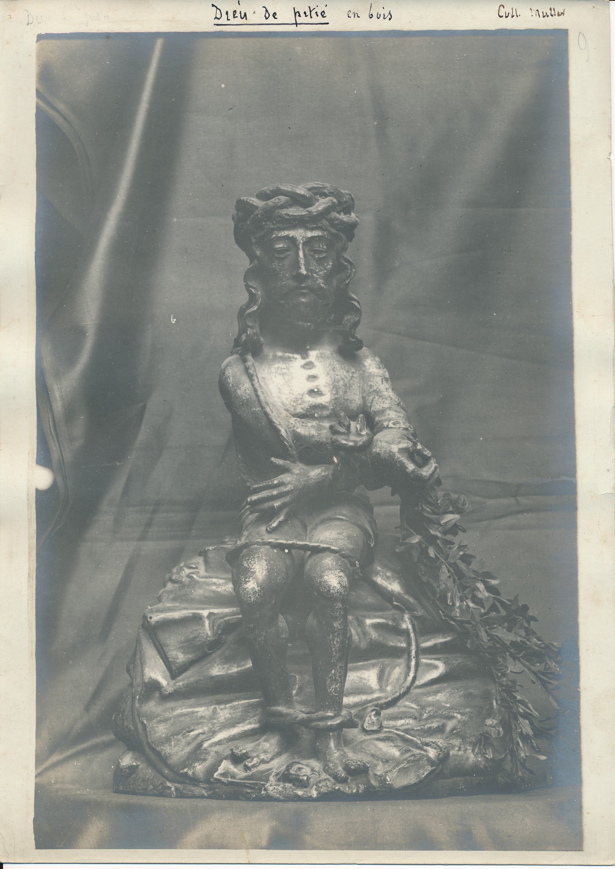 Titre de série : Collection Müller Titre : Dieu de pitié en bois Type de document : document graphique à deux dimensions Auteurs et Fonctions : Eugène Müller (1834-1918), Photographe Année de publication : [s.d. (avt 1914)] Importance : 1 épreuve photographique sur papier Illustrations : ill. en noir et blanc Format : 24 x 17 cm Langues : Français (fre) Sujets : [1 - Thésaurus UNESCO ] Culture:Arts visuels:Beaux-arts:Sculpture:Travail du bois Index. décimale : 731.885 3 Sculpture sur le thème de Jésus-Christ (analyse, critiques, histoire, œuvres non limitées à une période ni à un lieu) Forme de la ressource : Epreuve photographique Permalink : ./index.php?lvl=notice_display&id=20458 Collection Müller. Dieu de pitié en bois [document graphique à deux dimensions] / Eugène Müller (1834-1918), Photographe . - [s.d. (avt 1914)] . - 1 épreuve photographique sur papier : ill. en noir et blanc ; 24 x 17 cm.