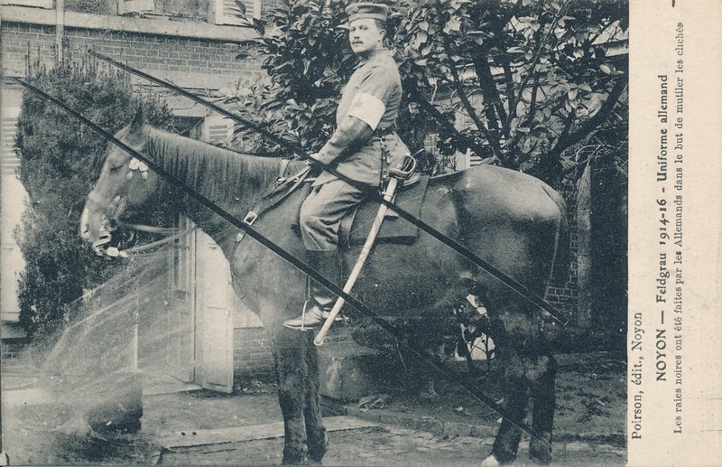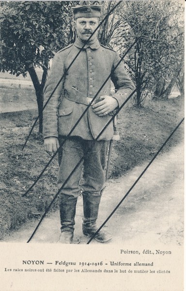 Titre : Noyon - Feldgrau 1914-16 - Uniforme allemand Type de document : document graphique à deux dimensions Editeur : Noyon : Poirson Année de publication : [s.d. (1917)] Autre Editeur : Paris : Le Deley Importance : 1 carte postale Format : 9x14 cm Note générale : Mention supplémentaire : Les raies noires ont été faites par les Allemands dans le but de mutiler les clichés Langues : Français (fre) Sujets : [1 - Thésaurus UNESCO ] Culture:Histoire:Histoire nationale:Histoire européenne:Histoire de France:1914-1918 : Première Guerre mondiale