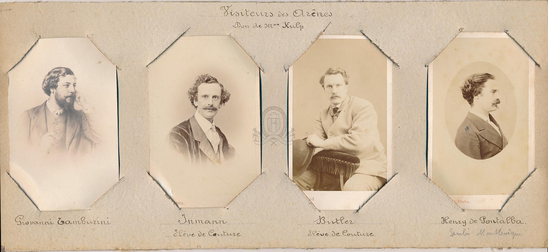 [3 - Thèmes locaux] Noms de personnages, personnes et collectivités:O...-Q... (Obré à Quentin):Pontalba (famille de):Pontalba, Henry de (19è siècle)Index. décimale : 778.92 Photographie de portraits Note de contenu : Portr. de Giovanni Tamburini - Inmann, élève de Couture, phot. de Fr. Hanfstaengl - Butler, élève de Couture, phot. de L. Durand - Henry de Pontalba, phot. de C. Robert à Senlis Permalink : ./index.php?lvl=notice_display&id=9001 Visiteurs des arènes : [planche de 4 portraits d'hommes] [document graphique à deux dimensions] / Franz Hanfstaengl (1804-1877), Photographe ; L. Durand (18..-18..), Photographe ; Clodomir Robert (18..-18..), Photographe . - [s.d.] . - 4 épreuves photographiques sur papier : portr. sépia ; 10 x 5 cm x 4 (14,5 x 32,5 cm).