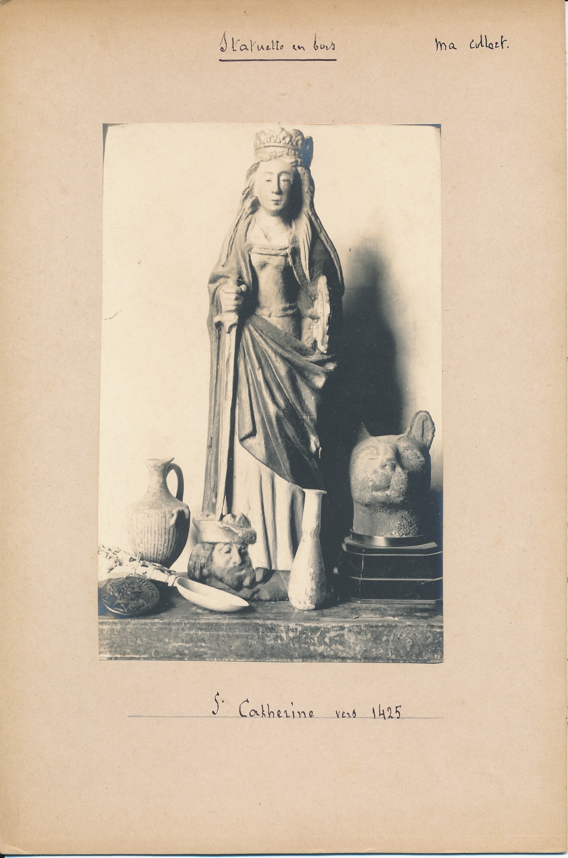 Titre de série : Collection Müller Titre : Statuette en bois de Ste Catherine vers 1425 Type de document : document graphique à deux dimensions Auteurs et Fonctions : Eugène Müller (1834-1918), Photographe Année de publication : [s.d. (avt 1914)] Importance : 1 épreuve photographique sur papier contrecollée sur carton Illustrations : ill. en noir et blanc Format : 15 x 9.5 cm (24.5 x 16.5 cm) Langues : Français (fre) Sujets : [3 - Thèmes locaux] Noms communs ou Sujets:C... (Camp à Cyclisme):Collections archéologiques Index. décimale : 704.948 63 Saints dans les arts décoratifs et les beaux-arts Forme de la ressource : Epreuve photographique Permalink : ./index.php?lvl=notice_display&id=20502 Collection Müller. Statuette en bois de Ste Catherine vers 1425 [document graphique à deux dimensions] / Eugène Müller (1834-1918), Photographe . - [s.d. (avt 1914)] . - 1 épreuve photographique sur papier contrecollée sur carton : ill. en noir et blanc ; 15 x 9.5 cm (24.5 x 16.5 cm).