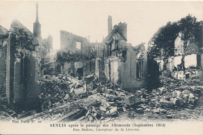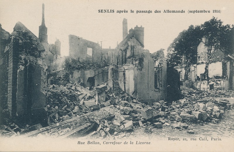 Senlis après le passage des Allemands (septembre 1914). Rue Bellon, carrefour de la licorne [document graphique à deux dimensions] . - Paris : Royer : Paris : Neurdein frères, [s.d. (1914)] . - 1 carte postale : sépia ; 9x14 cm. Langues : Français (fre)
