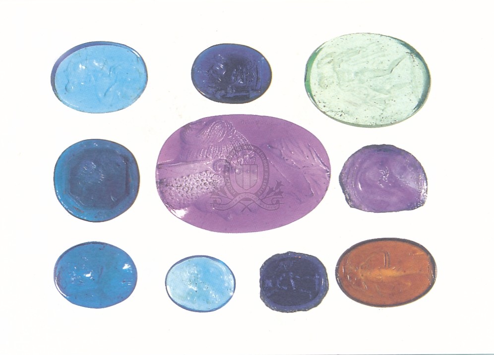 Moulages en pâte de verre d'après des intailles antiques et modernes : (Ulysse, Hercule et Cerbère, Psyché, Léandre, Ménade sacrifiant à Priape, Danseuse, Julia [document graphique à deux dimensions] / André Pelle, Photographe . - Senlis : Musée du Vermandois, 1997 . - 1 carte postale : ill. en coul. ; 17 x 12 cm. Paris, Bibliothèque nationale de France, Cabinet des médailles et antiques.