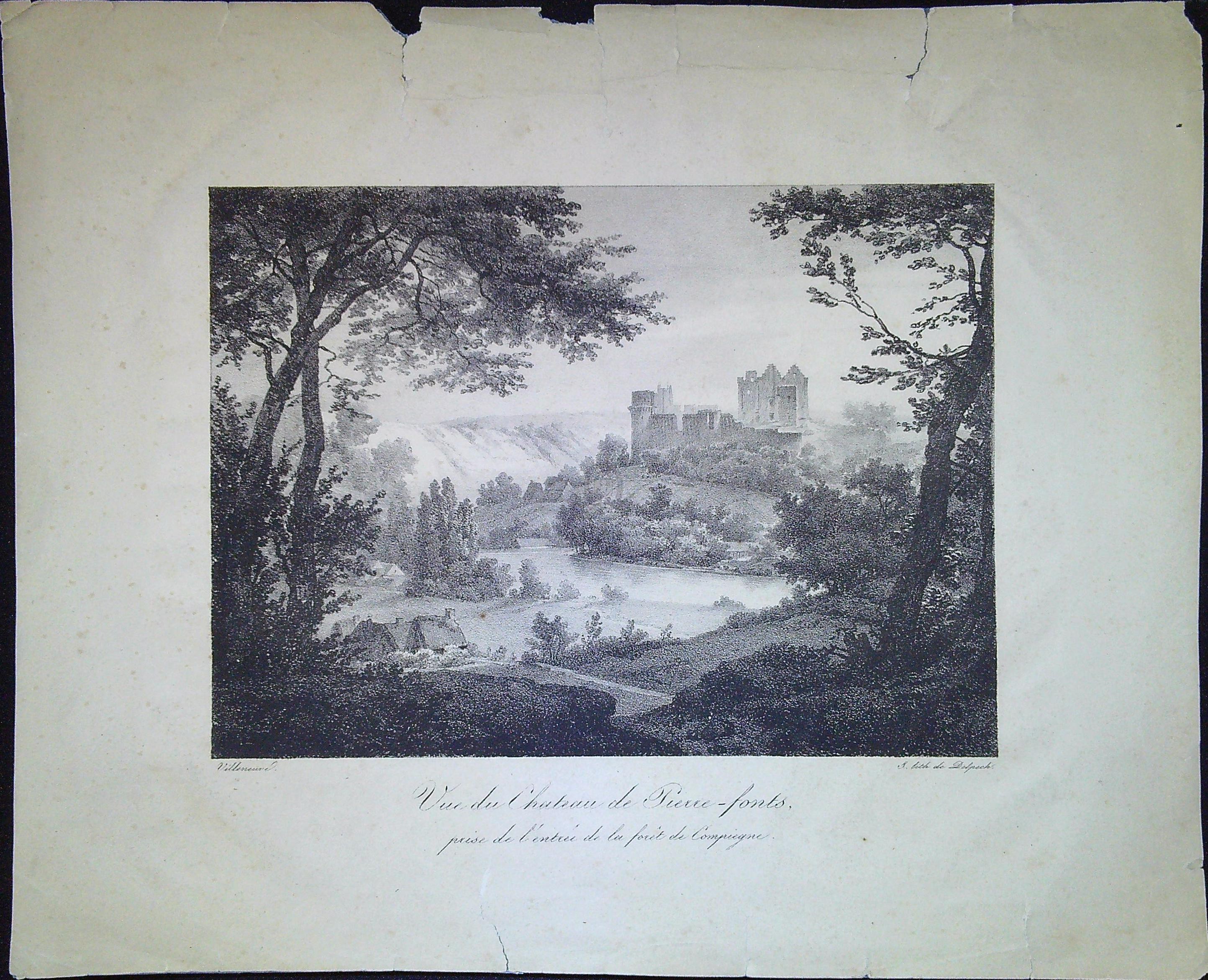 Titre : Vue du château de Pierre-fonts (sic) prise de l'entrée de la forêt de Compiègne Type de document : document graphique à deux dimensions Auteurs et Fonctions : Villeneuve (17..-18..), Illustrateur ; François Séraphin Delpech (1778-1825) , Lithographe