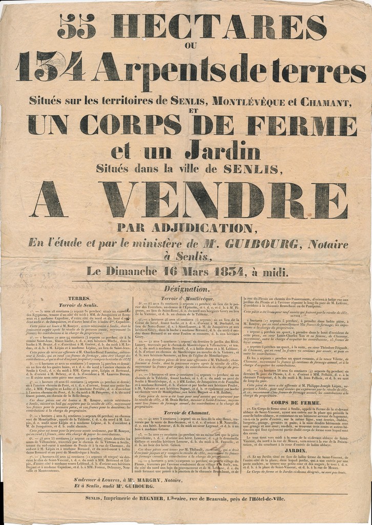 Il s'agit de la ferme de Saint-Vincent de SenlisLangues : Français (fre) Sujets : [1 - Thésaurus UNESCO ] Politique, droit, économie:Systèmes juridiques:Droit civil:Notariat, Patrimoine, Succession Permalink : ./index.php?lvl=notice_display&id=9318 55 hectares ou 134 arpents de terres situés sur les territoires de Senlis, Montlévêque et Chamant, et un corps de ferme et un jardin situés dans le ville de Senlis, à vendre par adjudication, en l'étude et par le ministère de Me Guibourg, notaire à Senlis, le dimanche 16 mars 1834 [...] : [placard] [texte imprimé] / Auguste Robert Guibourg (1785-1867), Nom associé . - Senlis : Régnier, 1834 . - 1 f. ; 61 x 43 cm.