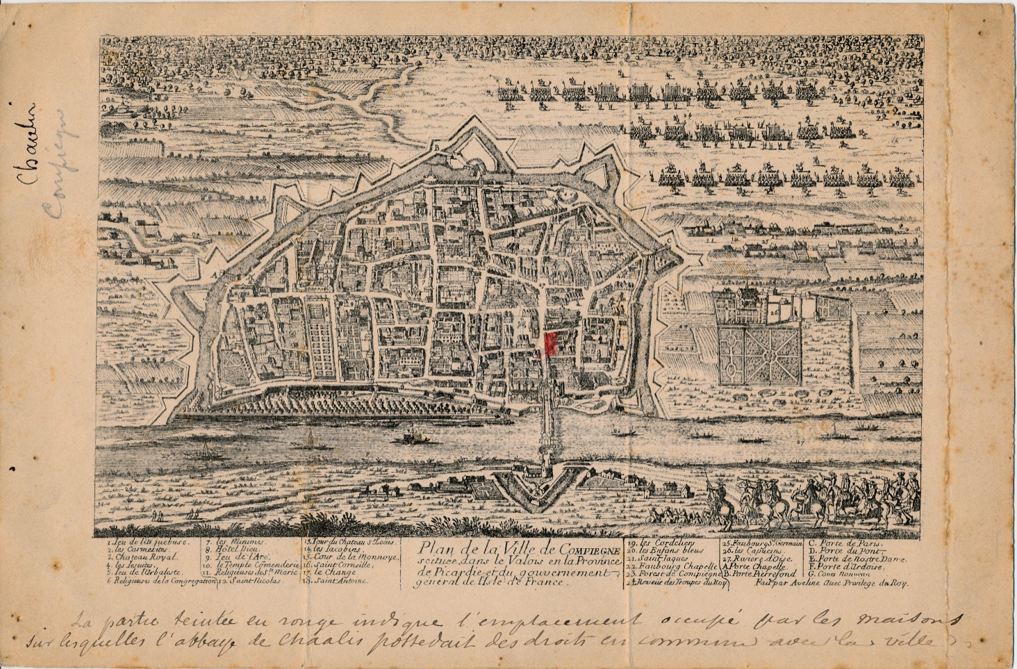 - EM 195 D : Plan de la ville de Compiègne située dans le Valois en la province de Picardie et du gouvernement général de l'Isle de France fait par Aveline. - 1722. - Estampe ; 16 x 25 cm.