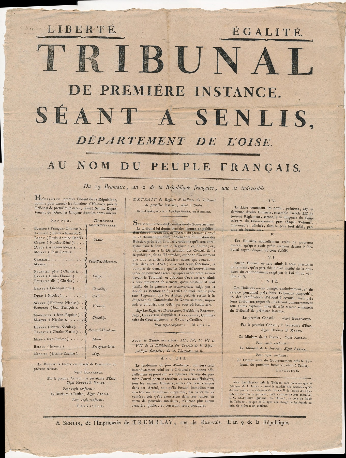 Titre : Tribunal de première instance, séant à Senlis, département de l'Oise. Extrait du registre d'audience du 13 brumaire, an 9 de la République française : [placard] Type de document : texte imprimé Auteurs et Fonctions : Tribunal de première instance (Senlis), Éditeur scientifique ; Napoléon Bonaparte (1769-1821), Auteur ; Denis-Martin Tremblay (1752-1822), Imprimeur Editeur : A Senlis : de l'imprimerie de Tremblay Année de publication : 1800 Importance : 1 f. Format : 59 x 45 cm Langues : Français (fre) Sujets : [2 - Thésaurus Brunet-Parguez ] Droit et Jurisprudence:Droit civil et criminel:Droit français à partir de la Révolution de 1789:Organisation de la justice Note de contenu : Liste des huissiers nommés par Bonaparte auprès du Tribunal de Senlis suivie de l'extrait du registre des audiences dudit Tribunal Permalink : ./index.php?lvl=notice_display&id=8735 Tribunal de première instance, séant à Senlis, département de l'Oise. Extrait du registre d'audience du 13 brumaire, an 9 de la République française : [placard] [texte imprimé] / Tribunal de première instance (Senlis), Éditeur scientifique ; Napoléon Bonaparte (1769-1821), Auteur ; Denis-Martin Tremblay (1752-1822), Imprimeur . - A Senlis : de l'imprimerie de Tremblay, 1800 . - 1 f. ; 59 x 45 cm.