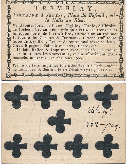 Titre : Tremblay, libraire à Senlis, place du béfroid, près la halle au bled : [publicité] Type de document : texte imprimé Auteurs et Fonctions : Denis-Martin Tremblay (1752-1822), Libraire ; Nicolas François Roze de Beaupré (17..-17..), Nom associé Editeur : Senlis : Tremblay Année de publication : 1773 Importance : 1 f. contrecollée sur une carte de jeu Format : 5,5 x 8,5 cm Langues : Français (fre) Permalink : ./index.php?lvl=notice_display&id=8869 Tremblay, libraire à Senlis, place du béfroid, près la halle au bled : [publicité] [texte imprimé] / Denis-Martin Tremblay (1752-1822), Libraire ; Nicolas François Roze de Beaupré (17..-17..), Nom associé . - Senlis : Tremblay, 1773 . - 1 f. contrecollée sur une carte de jeu ; 5,5 x 8,5 cm.