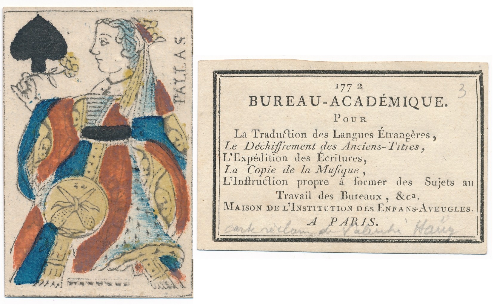 Sujets : [3 - Thèmes locaux] Noms de personnages, personnes et collectivités:H...-K... (Hallo à Klingsor):Haüy (les frères):Haüy, Valentin (1745 à 1822) Note de contenu : a - Carte réclame du Bureau académique pour la traduction [...] dirigé par V. Haüy, 1772.