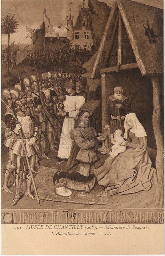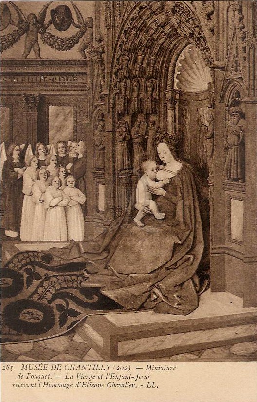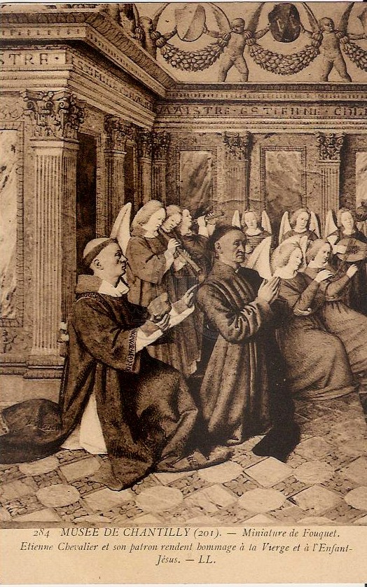 Étienne Chevalier et son patron rendent hommage à la Vierge et à l'enfant JésusURLMusée de Chantilly, 202. Miniature de Fouquet. la Vierge et l'enfant Jésus recevant l'hommage d'Étienne Chevalier ([s.d. (avt 1914)])