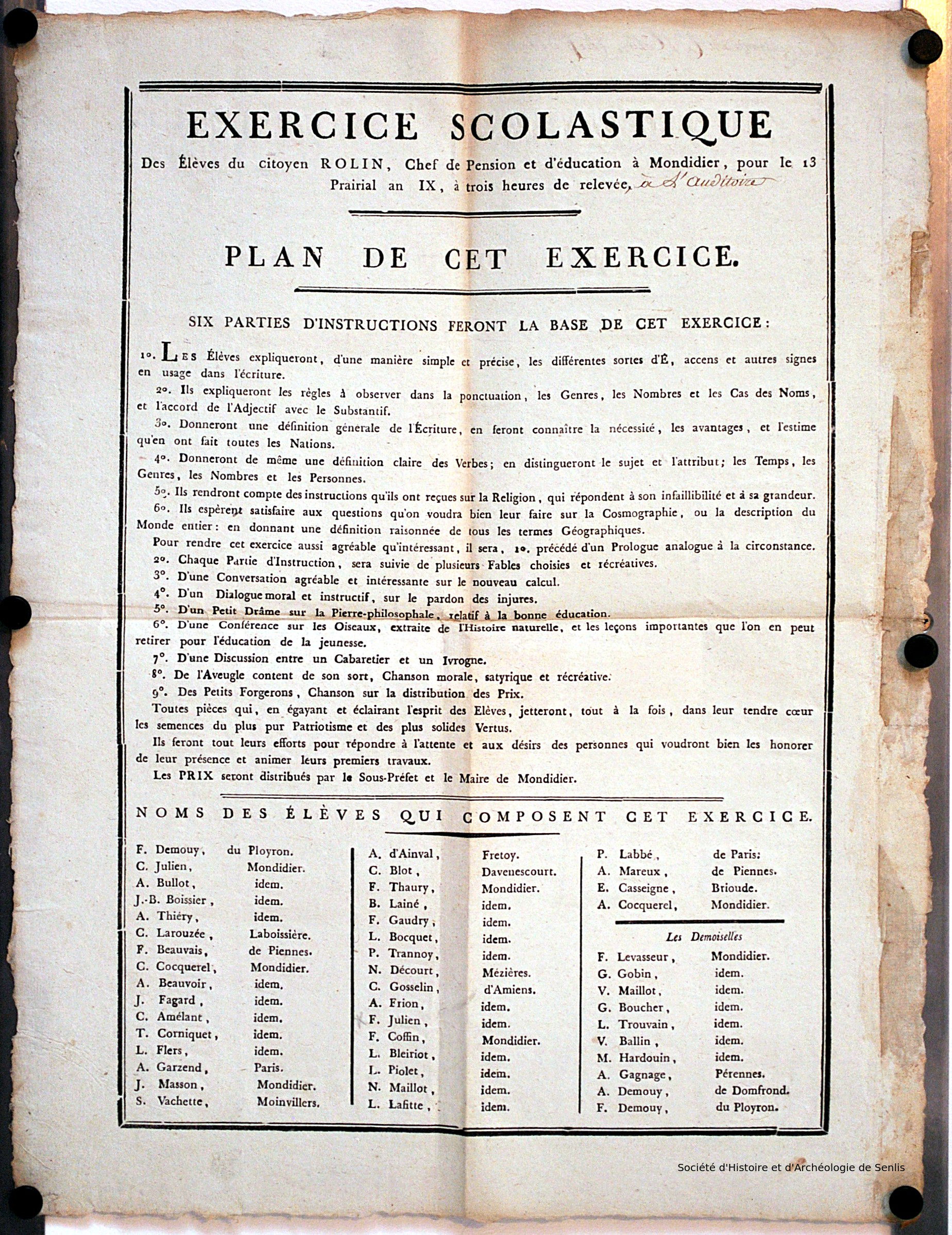PermalinkExercice scolastique des élèves du citoyen Rolin, chef de pension et d'éducation à Mondidier, pour le 13 prairial an IX [...] Plan de cet exercice ([s.d. (1801)])