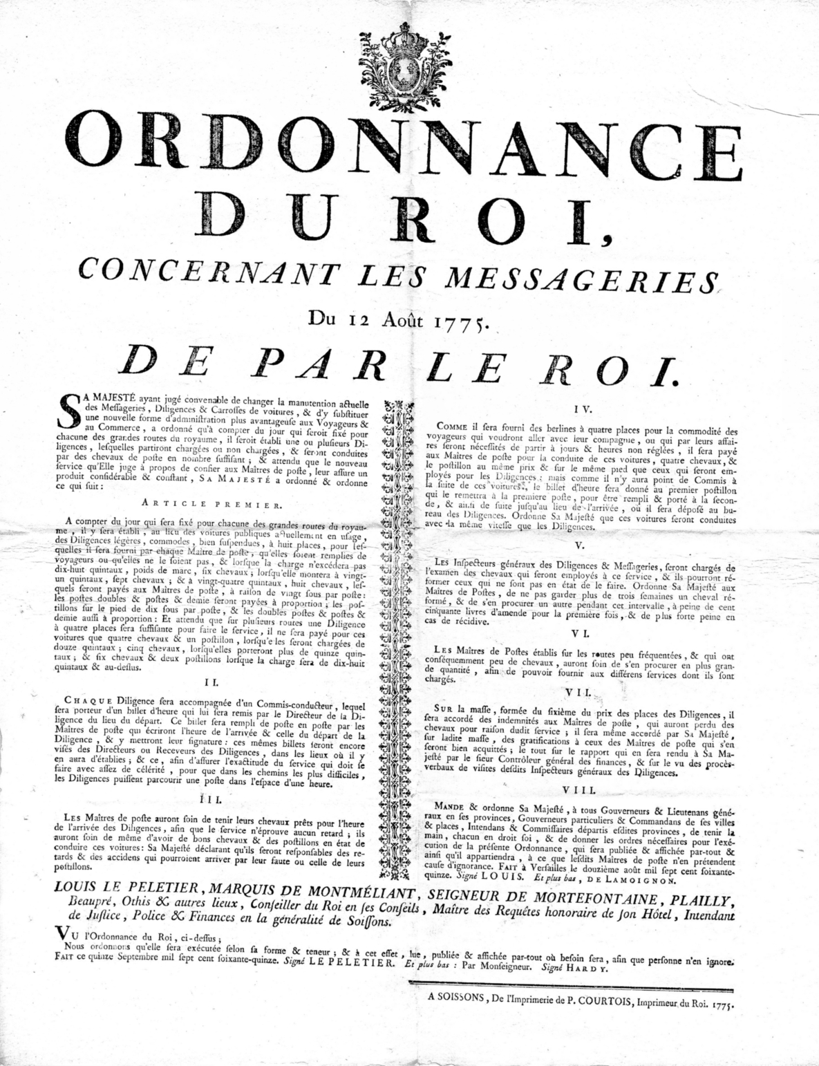 PermalinkOrdonnance du Roi,concernant les messageries. Du 12 août 1775 / Conseil d'Etat du Roi (13..-1791; France) (1775)