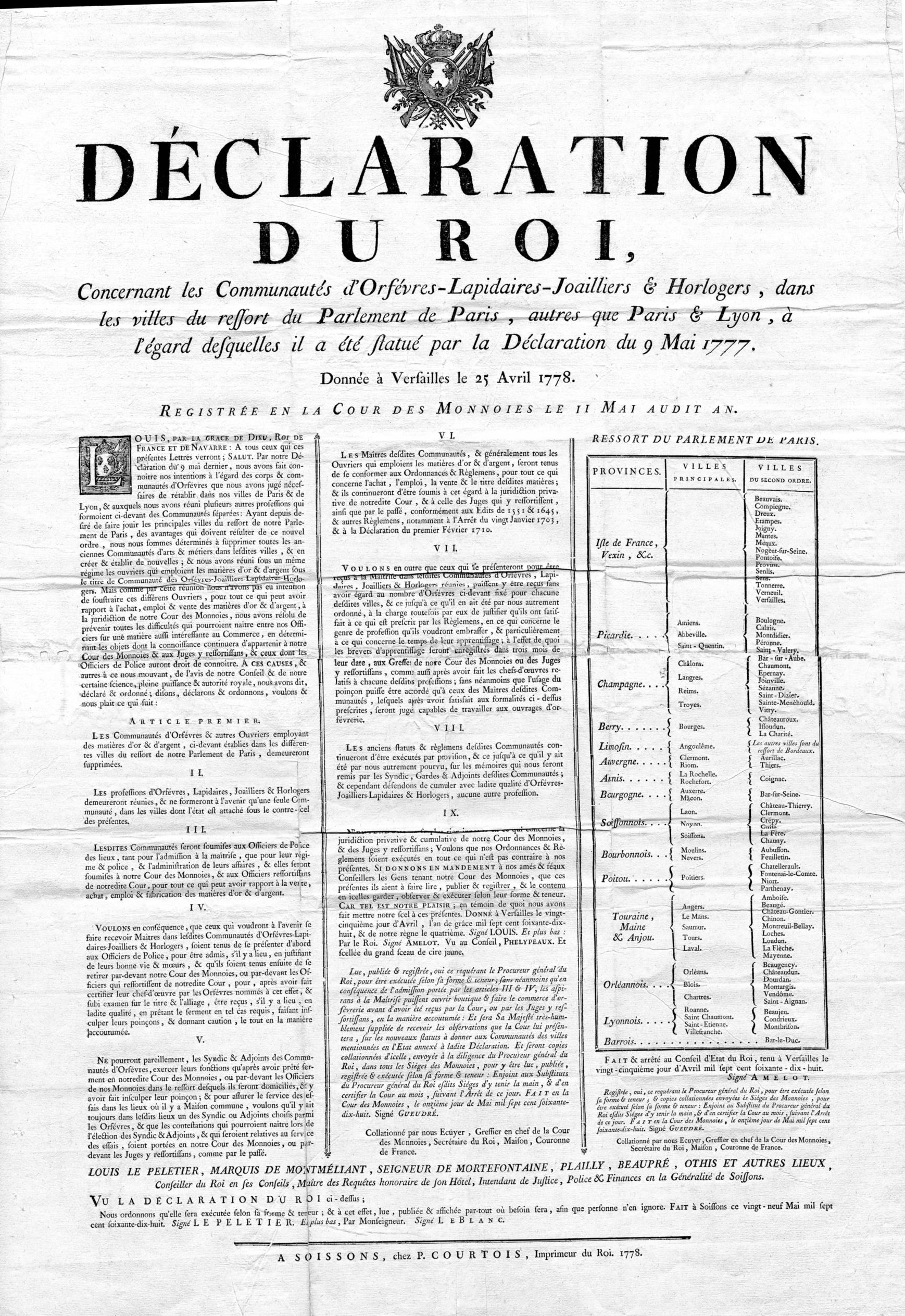 PermalinkDéclaration du roi, concernant les communautés d'orfèvres - lapidaires - joailliers & horlogers, dans les villes du ressort du Parlement de Paris, autres que Paris & Lyon, à l'égard desquelles il a été statué par la déclaration du 9 mai 1777. Donnée à Versailles le 25 avril 1778 / Conseil d'Etat du Roi (13..-1791; France) (1778)