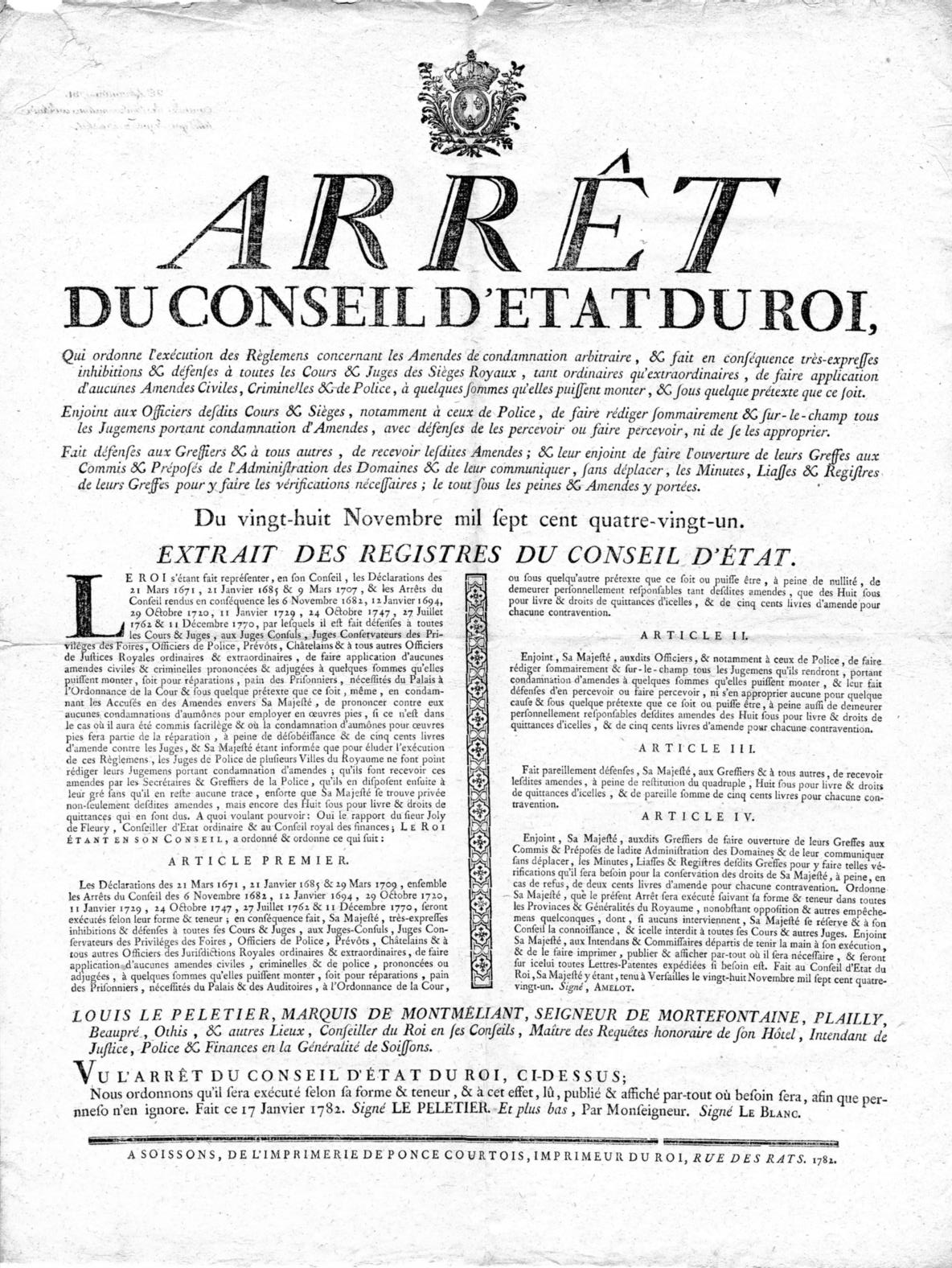 PermalinkArrêt du Conseil d’État du Roi, qui ordonne l'exécution des réglemens concernant les amendes de condamnation arbitraire [...] Enjoint aux officiers [...] de faire rédiger sommairement & sur le champ tous les jugemens portant condamnation d'amendes [...] Fait défenses aux greffiers & à tous autres, de recevoir ladites amendes ; & leur enjoint de faire l'ouverture de leurs greffes aux commis & préposés de l'administration des domaines [...] Du vingt-huit novembre mil sept cent quatre-vingt-un [1781] / Conseil d'Etat du Roi (13..-1791; France) (1782)