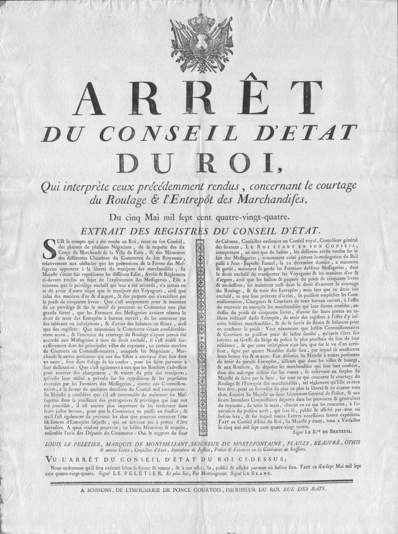 [2 - Thésaurus Brunet-Parguez ] Sciences et Arts:Sciences philosophiques, Education, Politique, Economie:Economie, économie sociale et domestique:Transports et navigation intérieure, entretien des routes, PostesNote de contenu : Le haut du placard est constitué de l'arrêt royal et le bas par un : Etat des lieux de la Généralité de Soissons où il est permis aux rouliers d'atteler à leurs voitures des chevaux de renfort, conformément à l'article 6 du présent arrêt Permalink : ./index.php?lvl=notice_display&id=8369 Arrêt du Conseil d’État du Roi, portant nouveau règlement sur le roulage. Du vingt-huit décembre mil sept cent quatre-vingt-trois [1783] : [placard] [texte imprimé] / Conseil d'Etat du Roi (13..-1791; France), Éditeur scientifique ; Louis XVI, roi de France (1754-1793)