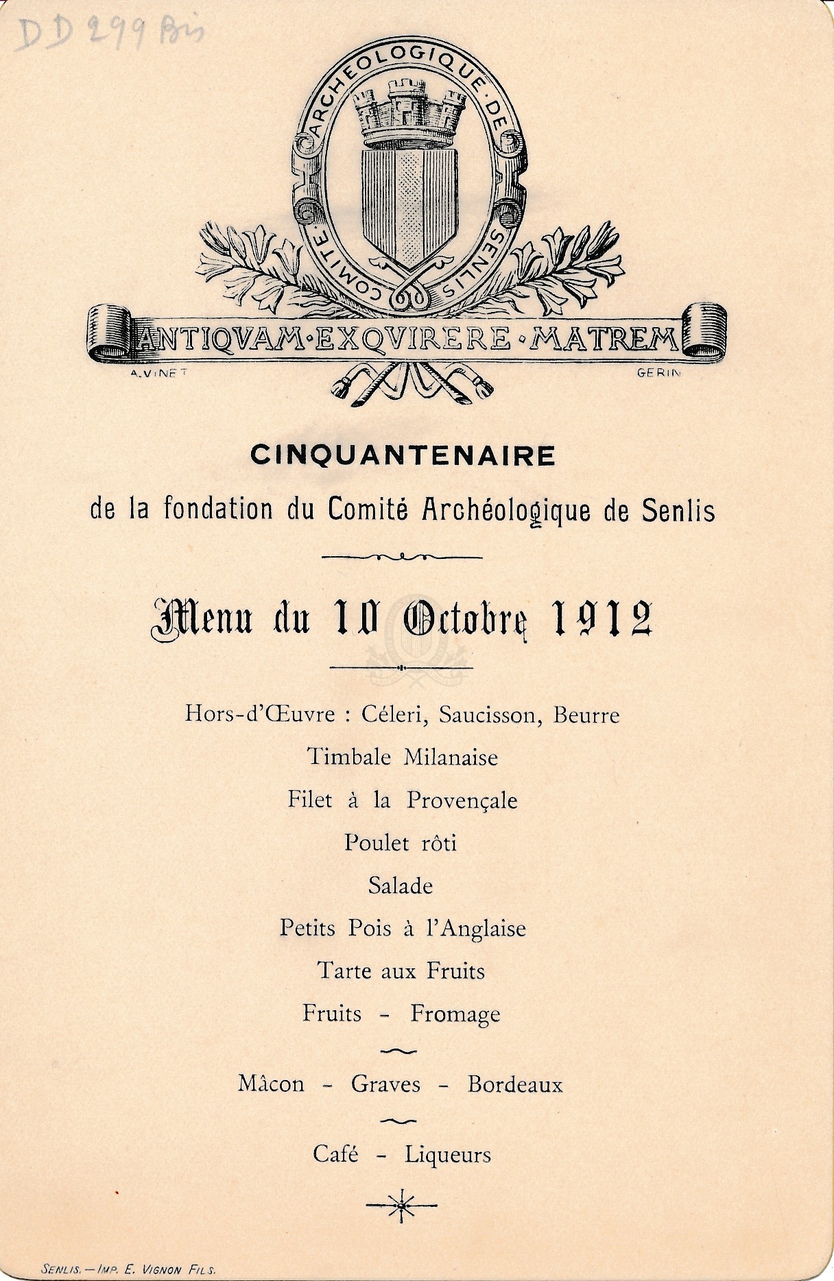 Menu du 10 octobre 1912 édité à l'occasion du cinquantenaire de la fondation du Comité archéologique de Senlis / Comité archéologique de Senlis (1912)